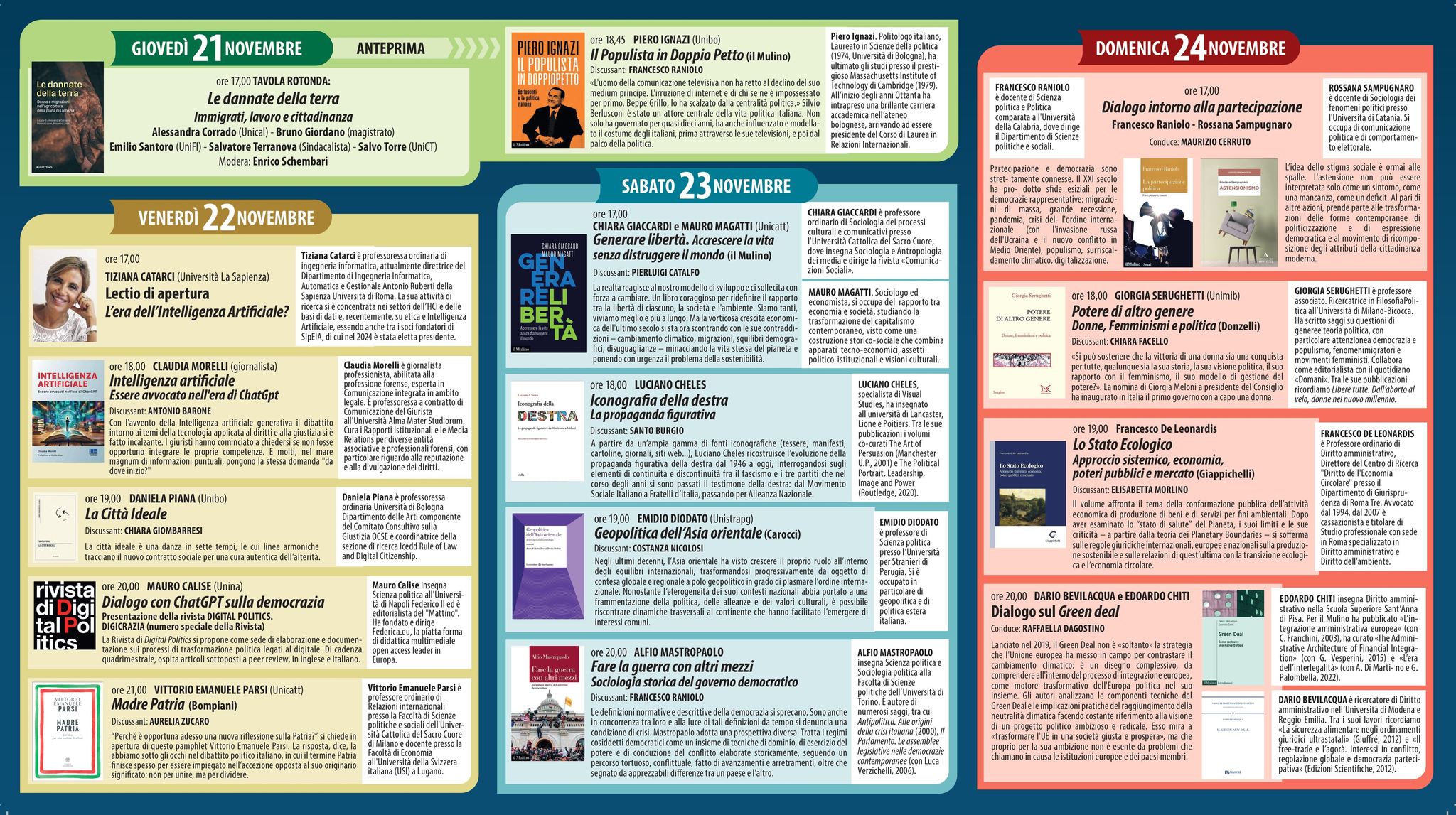 Ragusa – Tutto pronto per la quinta edizione della “Notte Bianca della Politica” che si terrà a Ragusa dal 21 al 24 novembre, un evento dedicato alla riflessione e al dibattito sui temi cruciali della democrazia contemporanea. Con un programma ricco di conferenze, tavole rotonde e presentazioni, la manifestazione offrirà uno spazio di confronto tra esperti, accademici e cittadini. L’evento, organizzato con la solita passione da Giorgio Massari, Francesco Raniolo, Antonio Barone ed Enrico Schembari e creato per stimolare il pensiero critico e la partecipazione attiva alla politica, quest’anno si arricchisce di un’anteprima ricca di contenuti. A partire dalle ore 17 di giovedì 21 novembre infatti, sarà organizzata una tavola rotonda dal tema “Le dannate della terra – Immigrati, lavoro e cittadinanza” per approfondire insieme il tema dell’immigrazione e dei diritti. A partecipare alla discussione moderata da Enrico Schembari ci saranno Alessandra Corrado (Unical), il magistrato Bruno Giordano, Emilio Santoro (UniFI), il sindacalista Salvatore Terranova, Salvo Torre (UniCT). L’incontro, che aprirà formalmente la quinta edizione della manifestazione ragusana, prende il nome dal libro scritto dalla stessa Alessandra Corrado insieme a Lorena Leone e Rossanna Liotti, e sarà l’occasione per approfondire uno dei temi più importanti che la politica deve affrontare in questo particolare periodo storico, un tema tra l’altro molto legato anche al nostro territorio. A completare la giornata di anteprima sarà la presentazione del libro “Il Populista in Doppio Petto” (Il Mulino) di Piero Ignazi. L’autore, che discuterà con Francesco Raniolo, presenterà il suo libro che analizza le fortune alterne della carriera politica di Silvio Berlusconi, dall’ascesa fino al declino, cercando di definire i diversi quadri storici che ne sono stati attraversati. Gli incontri della giornata di anteprima, come tutti gli incontri delle giornate successive, si svolgeranno presso la Camera di Commercio sita in piazza Libertà a Ragusa. La “Notte Bianca della Politica” continuerà nei giorni successivi con altri numerosi ed interessanti incontri. La giornata di venerdì 22 novembre vedrà anche l’atteso intervento della professoressa Tiziana Catarci, direttrice del Dipartimento di Ingegneria Informatica dell’Università La Sapienza di Roma, che terrà una lectio magistralis dal titolo “L’era dell’Intelligenza Artificiale” che farà sicuramente riflettere sull’impatto dell’IA nella società moderna, tra etica, tecnologia e politica. Tra i vari incontri dei giorni successivi ricordiamo la presentazione del libro “Generare libertà” di Chiara Giaccardi e Mauro Magatti che analizzeranno le sfide della contemporaneità e la ricerca di un modello di sviluppo sostenibile. Anche domenica 24 novembre sarà una giornata ricca di incontri che si concluderanno con il “Dialogo sul Green Deal” con Dario Bevilacqua e Edoardo Chiti. Per conoscere tutti gli incontri e gli appuntamenti della quinta edizione basta collegarsi sui canali social. La “Notte Bianca della Politica” è promossa dall’Associazione Culturale Scuola di Formazione Politica Italia Prossima, in collaborazione con L’Università di Catania, L’Università della Calabria, con il patrocinio del Comune di Ragusa, della Camera di Commercio del Sud Est della Sicilia, e la collaborazione del Movimento Federalista Europeo. Sponsor della manifestazione sono Si.Sac. s.p.a., Ghibli, Iblea Legnami, eVision, Agriplast e Cerad.