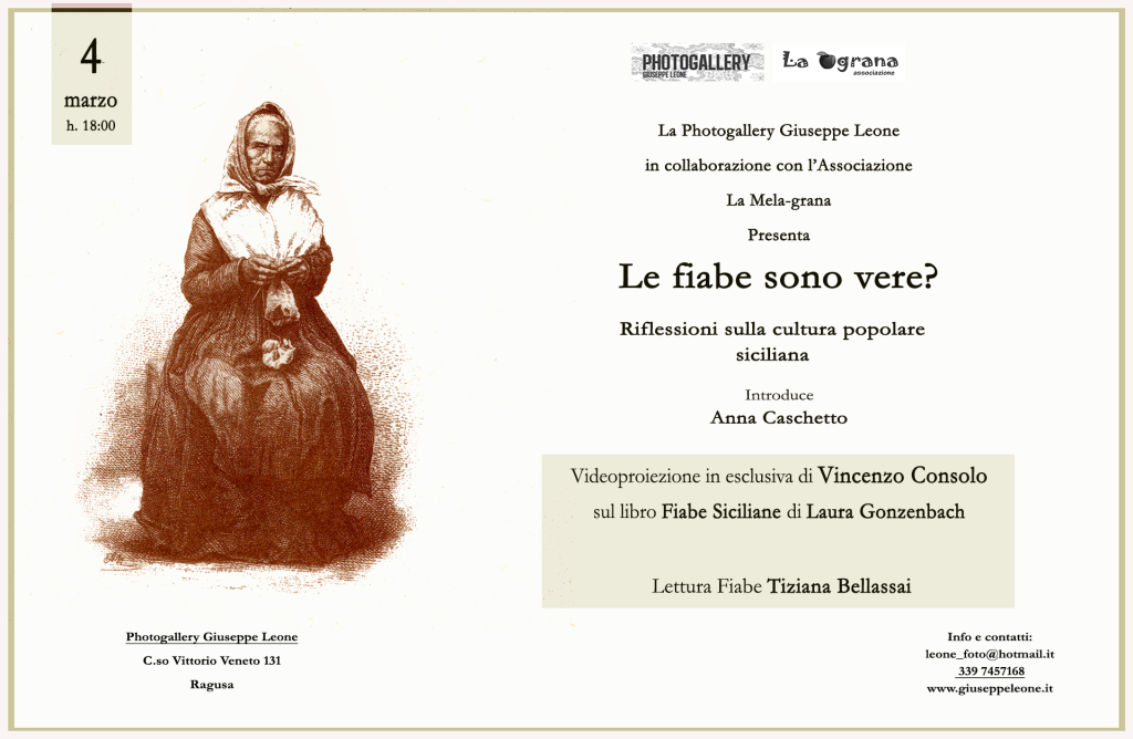 La cultura popolare siciliana è al centro di un evento organizzato dalla Photogallery Giuseppe Leone in collaborazione con l’associazione culturale La Mela-grana. Sabato 4 marzo alle ore 18:00, si terrà l’evento intitolato “Le Fiabe sono vere? Riflessioni sulla cultura popolare siciliana”.