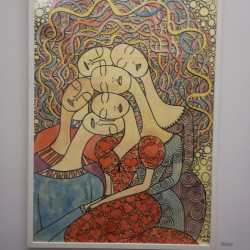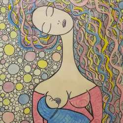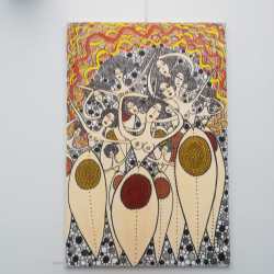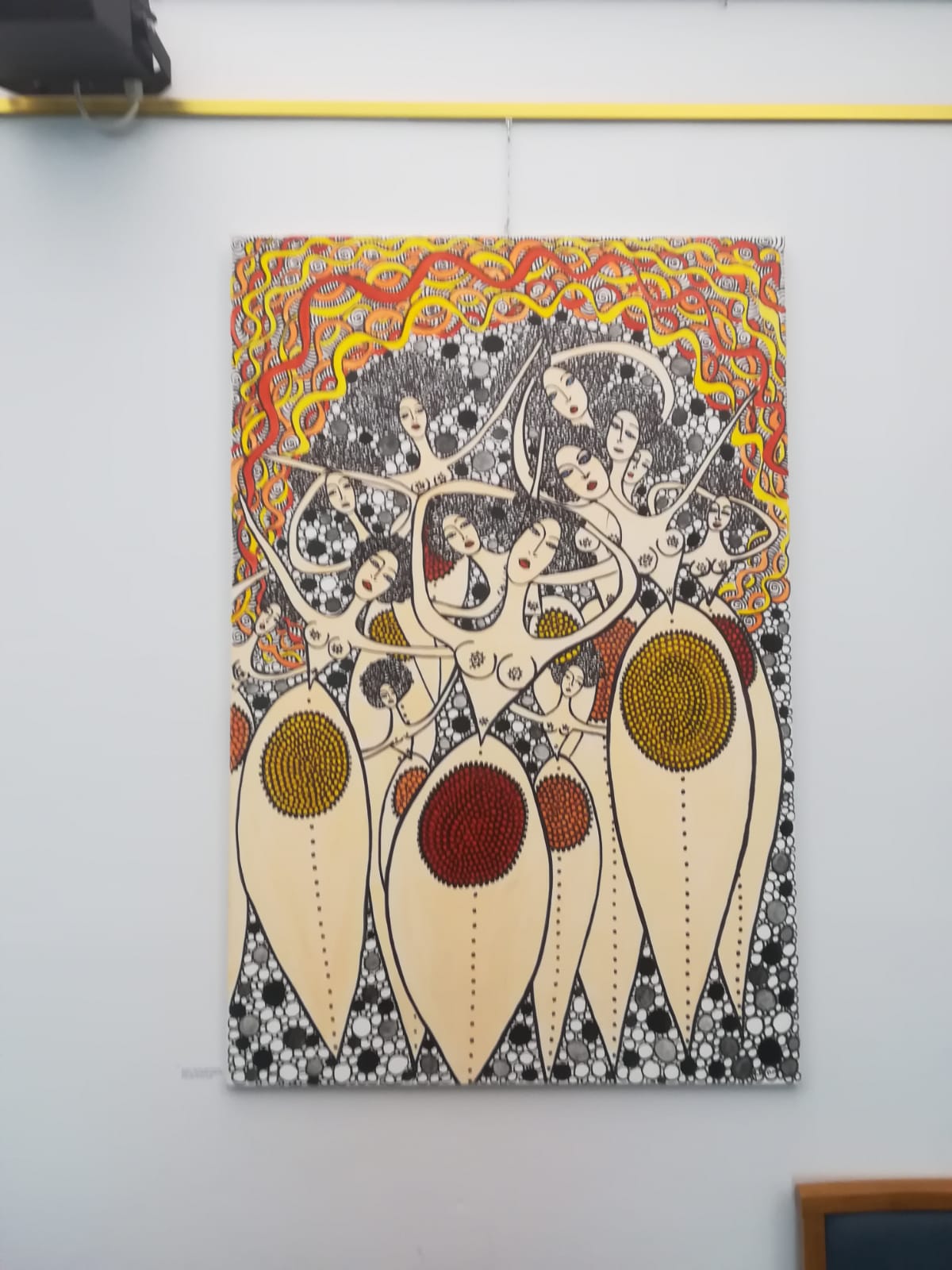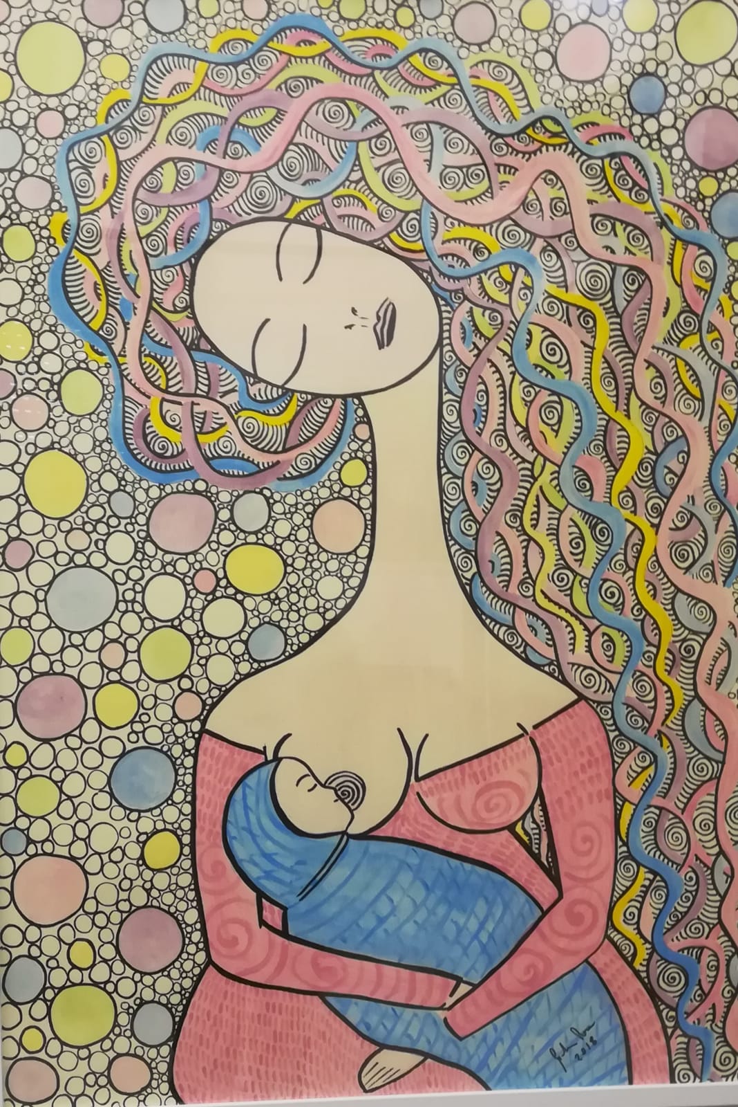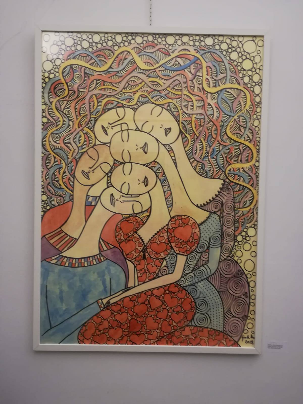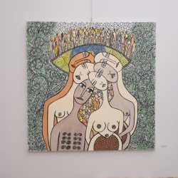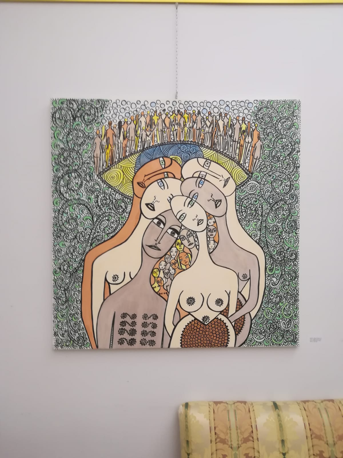 Una vivacità che si colloca nella dimensione ritrovata. Una pace interiore carica di carisma e di luce. Sono figure sinuose, quasi sempre donne che si chinano le une sugli altri, che abbracciano un bimbo, che generano altre vite in un ventre- involucro a forma di melograno segno dell’abbondanza e della procreazione. La matrice “genere umano alla ricerca di una meta” è evidente così come il senso di solidarietà che accompagna alcuni dipinti le cui sagome nude o a mani tese cercano accoglienza. Le radici sono alberi e poi sono mare, meno ancorate e aperte al cambiamento. Colori che rubano l’attenzione in un unicum di corpi, di seni accennati, di folti capelli e di abbracci.
