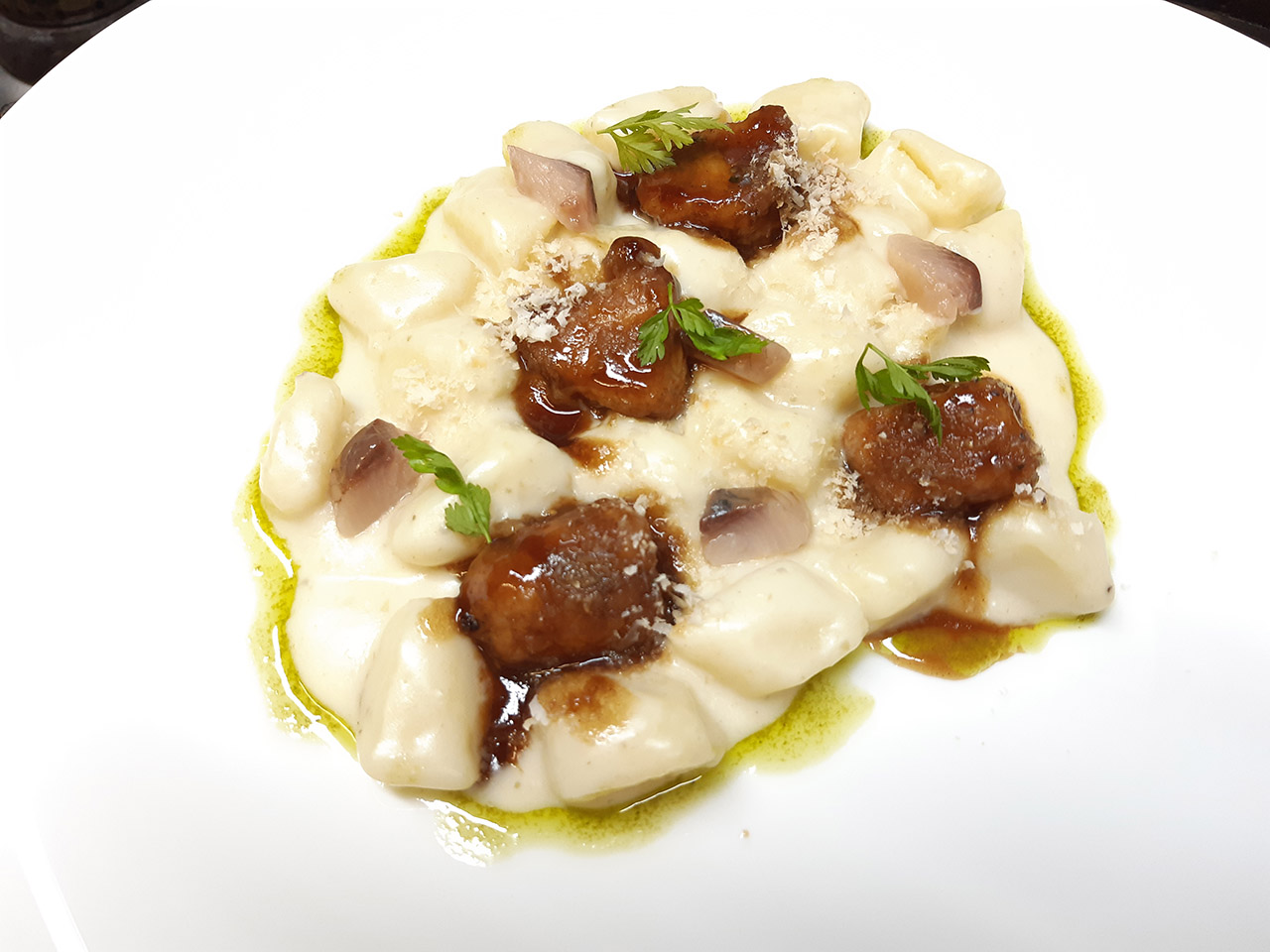 A contrapporre la semplicità delle verdure di stagione, gli *gnocchi di patate in salsa di mandorle e animelle di vitello brasate, sarda affumicata e olio di pesto*. Un piatto pieno di profumi e sapori importanti.