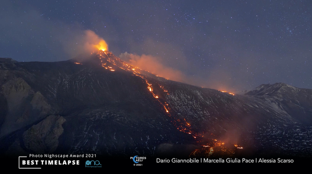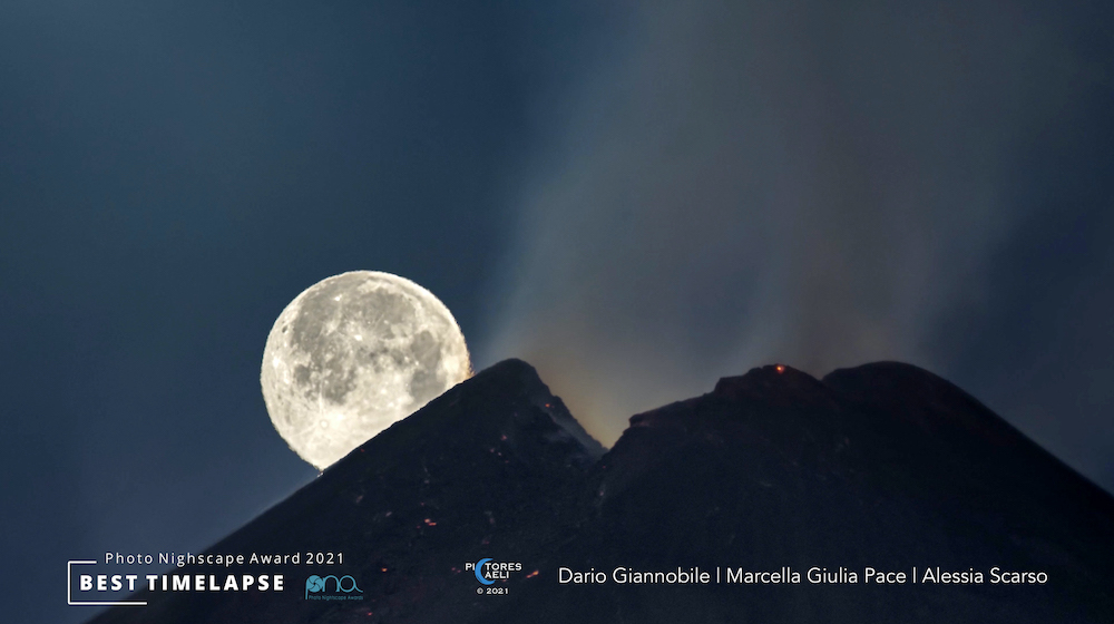 Si tratta di un filmato realizzato sull’Etna che mostra la Luna e gli astri alternarsi tra gli sbuffi e i parossismi del vulcano. I tre siciliani, tutti membri del noto gruppo di astrofotografi Pictores Caeli, hanno costruito un breve racconto sul vulcano più alto e attivo d’Europa, sito Unesco, in un periodo in cui l’Etna si è dimostrato particolarmente vivace, e che ha convinto la giuria francese ad attribuire loro il premio come miglior timelapse nell’edizione 2021 del PNA.