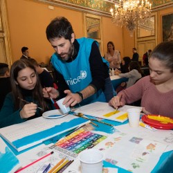 Dopo una meditata condivisione dei principi ispiratori della CRC, si è tenuto il concerto d’ouverture: agli strumenti musicali l’Orchestra “I care” dell’Istituto Comprensivo “Don Milani” di Scicli, impeccabili come sempre, diretti dai docenti e musicisti Lucrezia Ragusa, Luca Galizia, Giovanni Pisani e Gabriele Cattano. Quindi le preziose sale di Palazzo Spadaro, che ospitano uno dei sublimi mari di Piero Guccione, assieme ad altri capolavori firmati dai Maestri del Gruppo di Scicli, si sono trasformate in un grande laboratorio di pittura: a tenere una lectio magistralis agli studenti sono saliti in cattedra i Maestri Giovanni Blanco, Sandro Bracchitta, Carmelo Candiano, Giuseppe Colombo, Giovanni La Cognata, Franco Polizzi. Ai pennelli si è posta una rappresentanza di studenti iblei delle scuole iscritte per l’anno scolastico 2019/2020 al Progetto UNICEF – MIUR “Scuola Amica delle bambine, dei bambini e degli adolescenti”: gli Istituti Comprensivi “Maria Schininà” di Ragusa, “Don Lorenzo Milani” di Scicli, “Luigi Capuana” di Giarratana, “Giovanni Verga” di Comiso, “Gesualdo Bufalino” di Pedalino, “Giuseppe Rogasi” di Pozzallo, “Luigi Pirandello” di Comiso, “Leonardo Sciascia” di Scoglitti, “San Biagio” di Vittoria, “Elio Vittorini” di Donnalucata, “Antonio Amore” di Pozzallo, “Francesco Crispi” di Ragusa e la Direzione Didattica IV Circolo “Gianni Rodari” di Vittoria. Un grandioso team di docenti, provenienti da tutta la provincia, ha lavorato con passione con i propri alunni e per l’UNICEF alla Giornata mondiale dell’Infanzia.