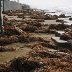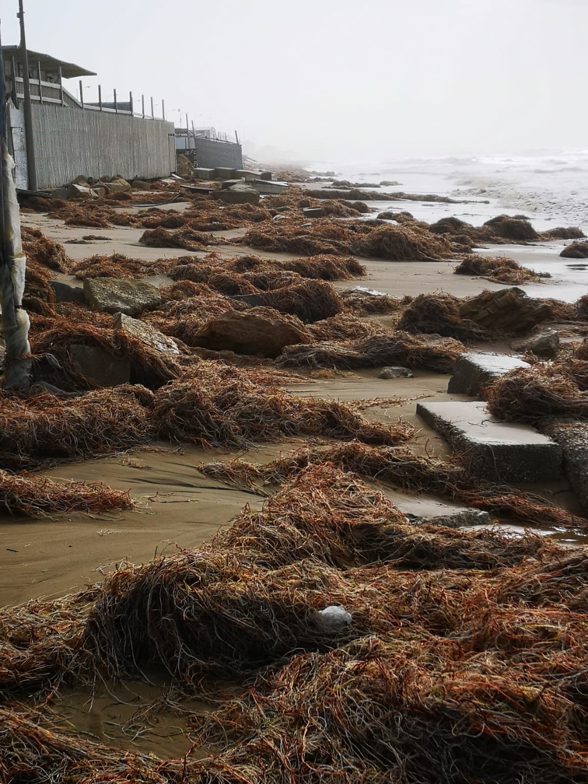 Un paesaggio spettrale, un disastro quasi annunciato. Il litorale è stracolmo di alghe, plastiche, rifiuti speciali come frigoriferi e bidoni. Su tutto, campeggia un odore nauseabondo di fitofarmaci.