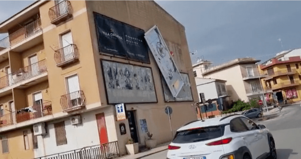 In via Ghandi alcuni cartelloni pubblicitari sono stati divelti e, in un caso, penzolavano pericolosamente rischiano di colpire auto e pedoni. Ad accorgersi dell’accaduto è stato il comandante della Polizia municipale, capitano Salvatore Giardina. È stato necessario l’intervento dei vigili del fuoco per la rimozione.