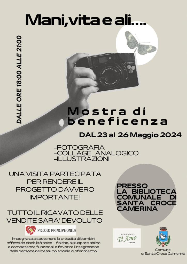 In corso, da giovedì 23 maggio, presso la Biblioteca Comunale G. Verga di Santa Croce Camerina, la mostra di beneficenza, “Mani, Vita e Ali…”, una mostra d’arte ideata progettata dalla titolare della casa di riposo “Ti Amo Ancora”, Rossella Ragusa con il sostegno dell’Amministrazione Comunale.