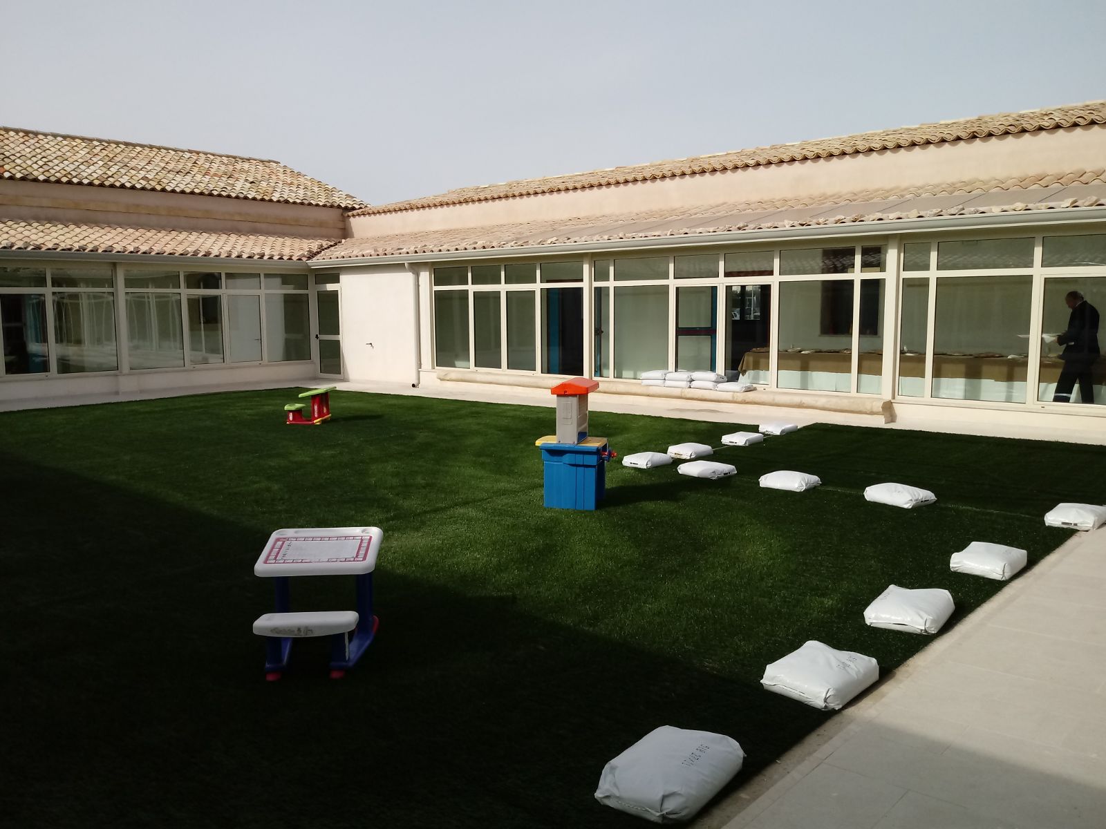 Sono state realizzate* tre aule, un laboratorio, la sala mensa, la sala insegnanti e gli ambienti di servizio*. Previsto anche l’*isolamento termico, un impianto di riscaldamento a pavimento e un impianto fotovoltaico*. Al fine di ridurre il fabbisogno di risorse idriche pubbliche, inoltre, poiché la masseria era dotata di un *impianto di recupero delle acque piovane dai tetti *(costituito da grondaie e pluviali, da una cisterna scavata nella roccia e dal pozzo che la alimentava) si è pensato di ripristinarlo e sono stati progettati due impianti idrici separati, di cui uno per l’acqua potabile.