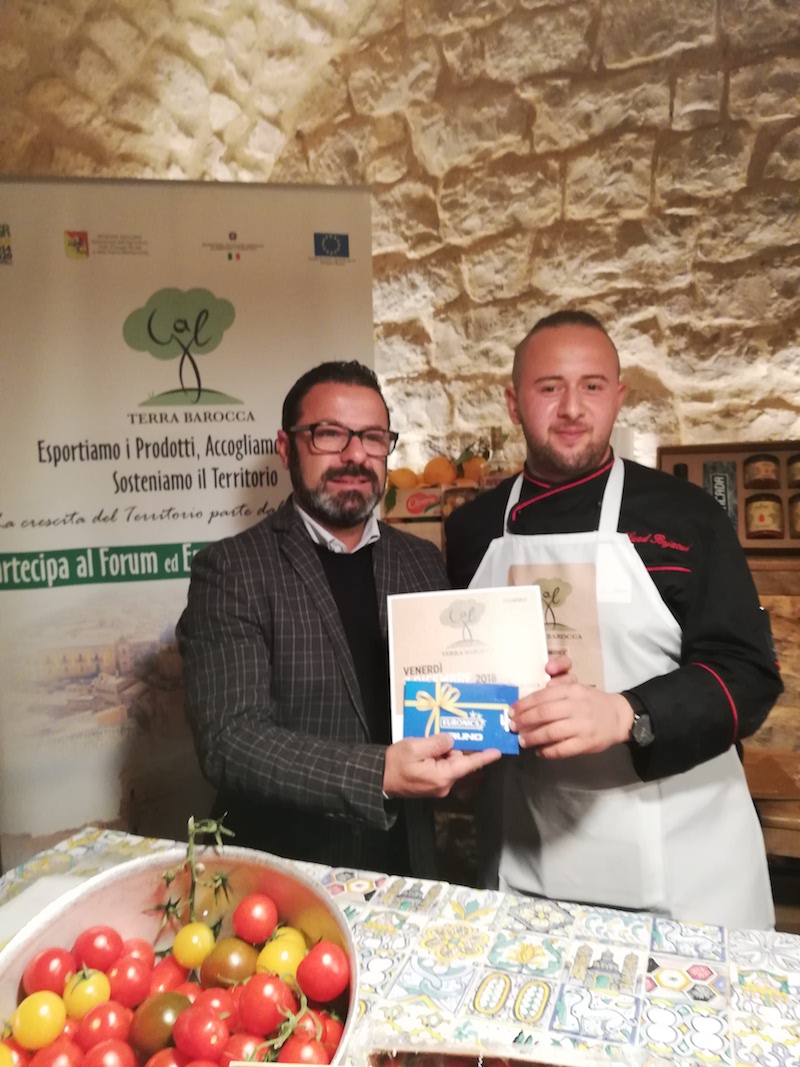 A vincere il contest culinario promosso dal Gal Terra Barocca è stato Massimiliano Mollame con il suo Tappe Barocche: cefalo in oliocottura su letto di fagiolo cosaruciaro e cioccolato di Modica con croccante al sesamo.