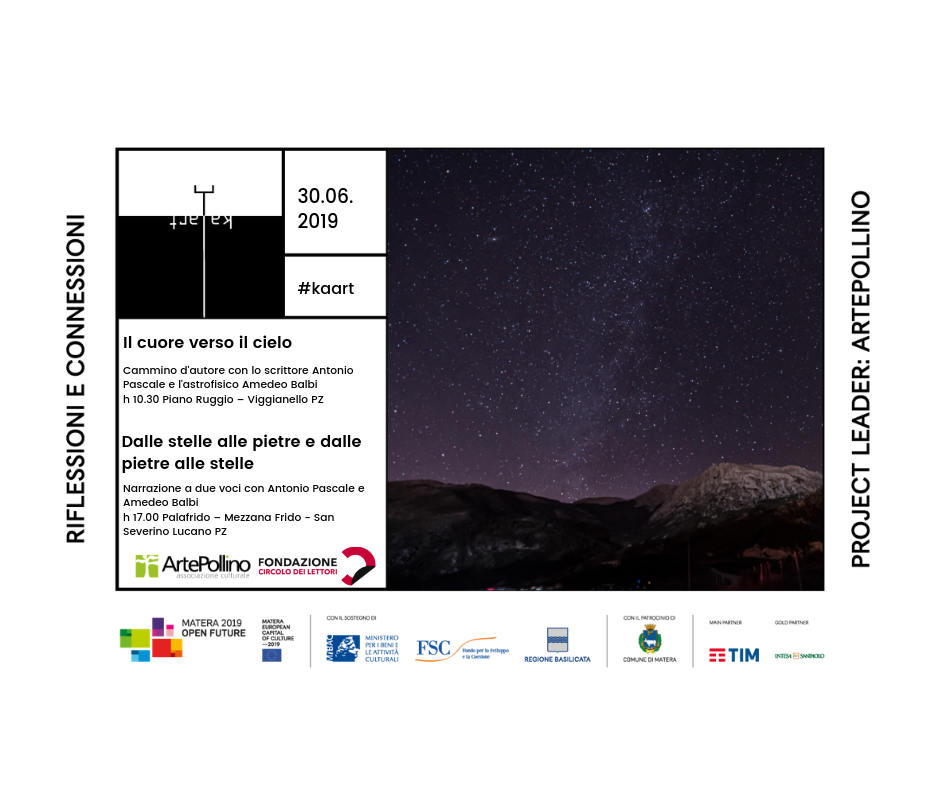 Visioni del paesaggio, voci e ritratti umani. Continua *Cammini d’autore per Matera 2019*, inserito nell’ambito del progetto Ka Art. Per una cartografia corale della Basilicata, co-prodotto dall’associazione ArtePollino e la Fondazione Matera-Basilicata 2019 in partnership con la Fondazione Circolo dei lettori. L’idea che anima il progetto è trasformare l’area del Pollino in una grande mappa al naturale, e rivivere il territorio, crocevia di esperienze e relazioni, camminando. Il tutto con l’aiuto di artisti, performer e scrittori: Elvira Dones, scrittrice cosmopolita di origini albanesi, Marco Cazzato, illustratore, Matteo Caccia, storyteller, scrittore e conduttore radiofonico, Antonio Pascale, scrittore e Amedeo Balbi, astrofisico.