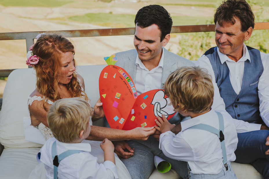 Il pomeriggio, invece, è stato organizzato nella piscina della masseria. Al tramonto, via i costumi e di nuovo con addosso gli abiti della festa, festa in terrazza con una birra per gli adulti e bimbi scatenati con la baby dance organizzata ad hoc per farli divertire. Un divertimento sfrenato prima di andare a nanna. Perché le tradizioni e gli usi di casa non si cambiano. I piccoli vanno a letto presto. E così alle 20, dopo aver portato in camera i bambini, tutti gli adulti si sono accomodati in giardino per il ricevimento di nozze. Un buffet con cibo rigorosamente siciliano, una tavolata unica, tipica dei festeggiamenti degli stranieri. E poi dediche, “discorsi” dei parenti e tanti regali.