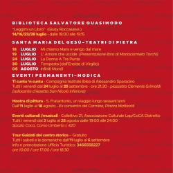 Molto ricco il programma del teatro diviso tra l’anfiteatro di S.Giuseppe u Timpuni e S.Maria del Gesù. Il 18 luglio Pippo Pattavina porta in scena Amori di Sicilia. A S.Maria in scena “Mi chiamo Maris e vengo dal mare”. Il 19 luglio L’Amore che uccide, presentazione del libro di Mariacarmela Torchi, mentre il 24 luglio in scena La Donna a tre Punte. Il 30 luglio Tempesta dall’Eneide di Virgilio. Il 6 agosto Infiniti Mondi. L’11 agosto Andrea Tidona e i Cunti re viddani, il 13 Enrico Lo Verso in “Uno, nessuno e centomila”, il 20 agosto Viaggio attraverso i dialetti. Per quanto riguarda gli eventi permanenti tutti i venerdi nella piazzetta Clemente Grimaldi “Ti cuntu ncuntu”, dall’11 luglio al 18 agosto ex Convento del Carmine la mostra del maestro Fratantonio, tutti i sabati e le domeniche tour guidati del centro storico e di Modica Alta.