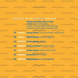 A Frigintini in Piazza Ottaviano il 18 luglio il cinema di Ficarra e Picone con Nati Stanchi, il 25 luglio balli di gruppo con Dino Migliorisi, il primo di Agosto Baaria, l’8 agosto il cabaret di Piero Pisana, il 16 agosto spettacolo di Pipitonella. Il 22 agosto serata live con i Guisar, il 29 agosto balli di gruppo con Dino Migliorisi.