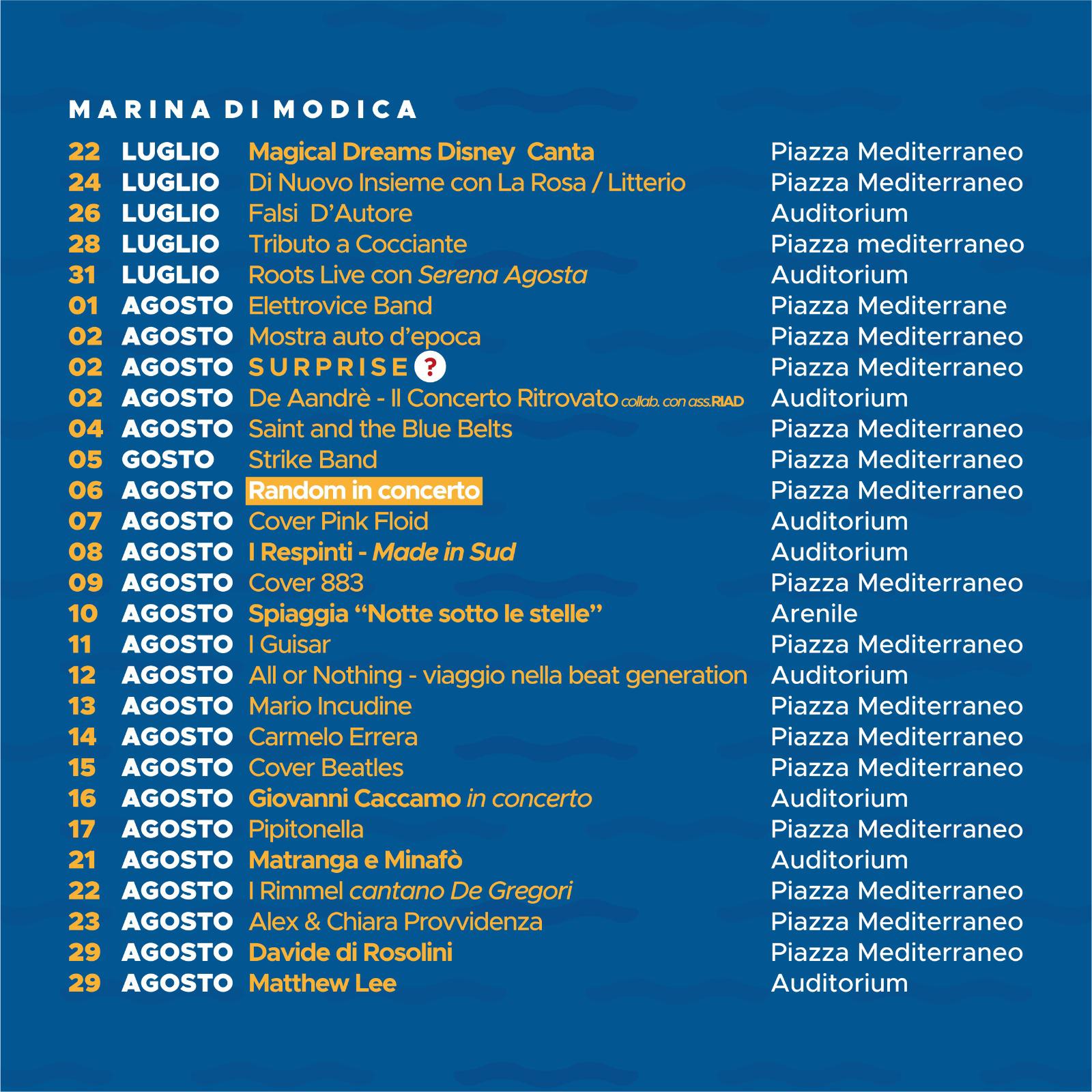 Marina di Modica, come è logico che sia, è la location con la maggior parte di eventi in programma. Tantissima la musica a cominciare dal 22 luglio con Magical Dreams Disney Canta per rivivere vecchi e nuovi cartoni targati Disney. Il 31 luglio il live della cantautrice nostrana Serena Agosta, il 2 agosto il “Concerto ritrovato” di Fabrizio De Andrè. Il 4 agosto i Saint and the Blue Belts, il 5 sarà la volta del rock n’ roll degli Strike. 11 agosto appuntamento con i Guisar, il 12 la Beat Generation verrà spiegata in “All or nothing”. Il 13 agosto sarà la volta di Mario Incudine, una delle voci più importanti della nostra terra siciliana e il 16 toccherà invece a Giovanni Caccamo cantare per la sua gente. Il 23 agosto Alex e Chiara Provvidenza, il 29 Davide Di Rosolini. Ci sono poi le fantastiche cover band che faranno rivivere le canzoni dei loro ispiratori più famosi. Il 28 luglio ci saranno le canzoni di Riccardo Cocciante, il 7 agosto la cover dei Pink Floyd, il 9 agosto “Gli Anni”, cover degli 883, il 15 agosto la “Liverpool Band” che canterà le canzoni dei Beatles, il 22 i “Rimmel” interpretano De Gregori. Per i più giovani appuntamento da non perdere il 6 agosto con uno dei cantanti del momento, Random. Per il cabaret il 24 luglio in Piazza Mediterraneo Litterio e Salvo La Rosa nel loro show “Di nuovo Insieme”.
