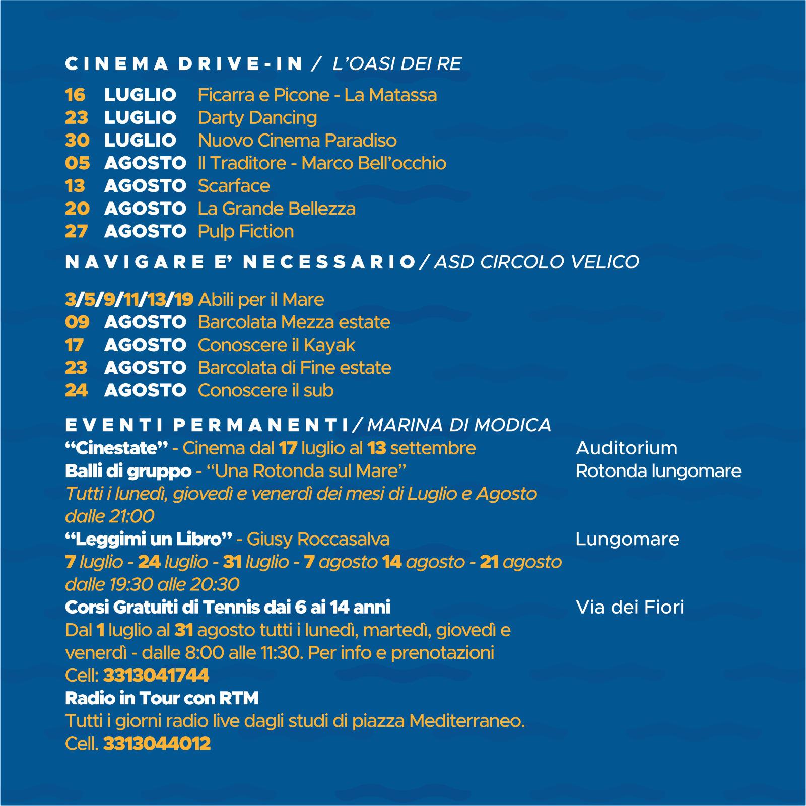 Il 26 sarà il turno dei Falsi D’Autore, l’8 agosto I Respinti (Made in Sud), il 17 agosto Pipitonella e il 21 Matranga e Minafò. La novità di quest’anno è il Drive In che ha già iniziato la sua programmazione. Nel parcheggio dell’Oasi dei Re altri 5 appuntamenti da non perdere per vedere grandi film del passato come si faceva negli anni 50. Il 23 luglio l’intramontabile Dirty Dancing, il 30 il capolavoro premio oscar Nuovo Cinema Paradiso, il 5 agosto Il Traditore, la storia del pentito Buscetta. Il 13 agosto l’immortale Scarface, il 20 agosto un altro premio oscar italiano, La Grande Bellezza, si chiude il 27 con il classico Pulp Fiction. Spazio anche allo sport di stagione con quattro appuntamenti targati Circolo Velico che prevedono barcolata, kayak e subacquea e al tennis con corsi di tennis gratuiti per bambini dai 6 ai 14 anni. Ci sono poi gli appuntamenti fissi come il Cinestate all’Auditorium, la lettura di libri per bambini e ragazzi, i balli di gruppo Una Rotonda sul Mare e il live broadcasting di RTM ogni giorno da Piazza Mediterraneo.
