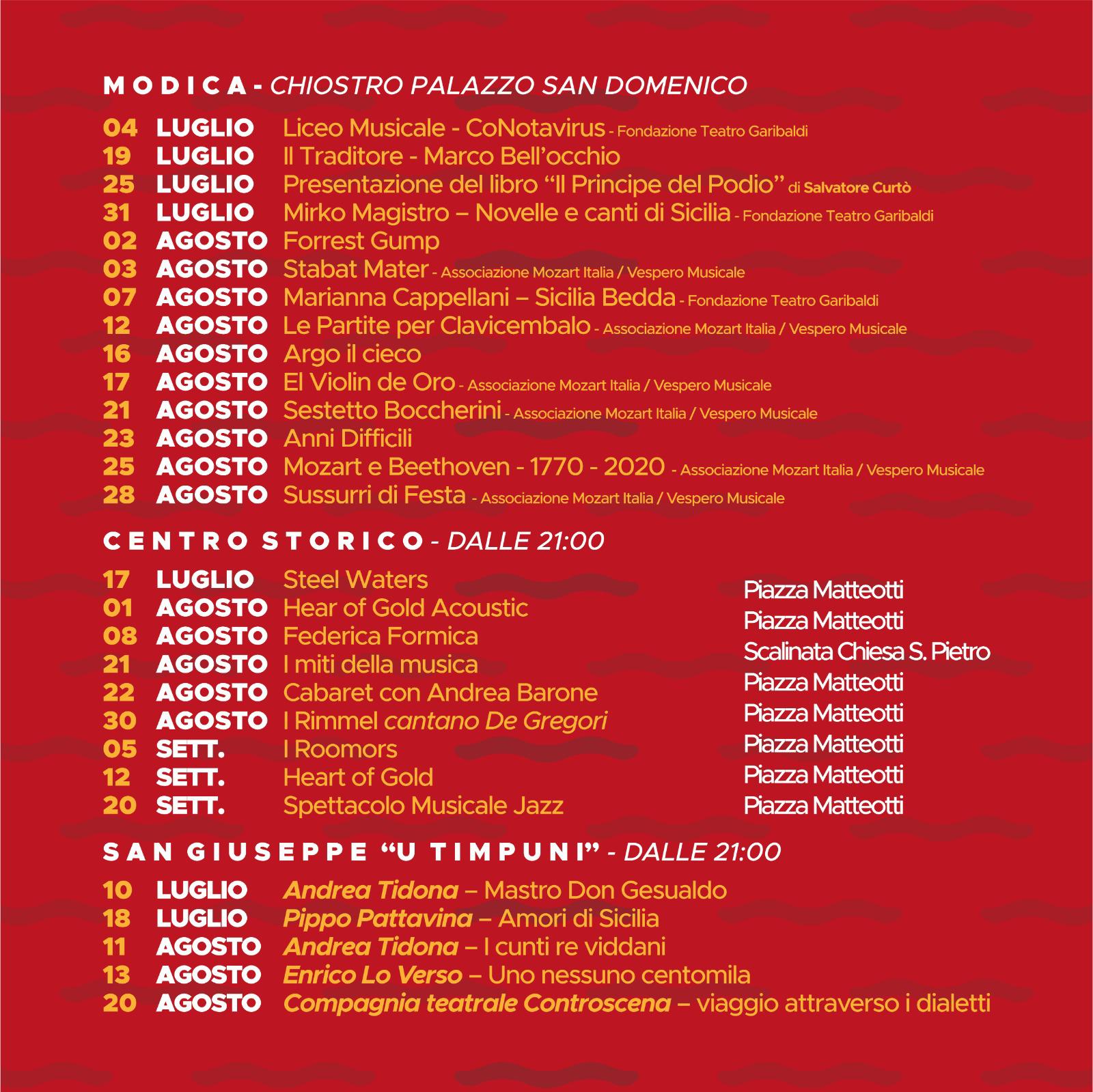 Il cartellone musicale prevede tantissimi appuntamenti dall’alto valore culturale come Partita per Clavicembalo il 12 agosto, El Violin de Oro il 17 agosto, il 21 il Sestetto Boccherini, Mozart e Beethoven il 25 agosto. Il primo agosto Hear of Gold Acoustic, giorno 8 agosto Federica Formica canta sulla scalinata di S.Pietro canti della tradizione siciliana reinterpretati in chiave moderna, il 21 agosto I Miti della Musica, il 5 settembre i Roomors, il 12 Heart of gold e infine il 20 settembre spettacolo musicale jazz. Il grande schermo a Modica sarà presso il chiostro di Palazzo S.Domenico dove gratuitamente si potrà assistere il 19 luglio al Traditore di Marco Bellocchio, il 2 agosto Forrest Gump, il 23 agosto Anni Difficili il film girato interamente a Modica nel primo dopoguerra.