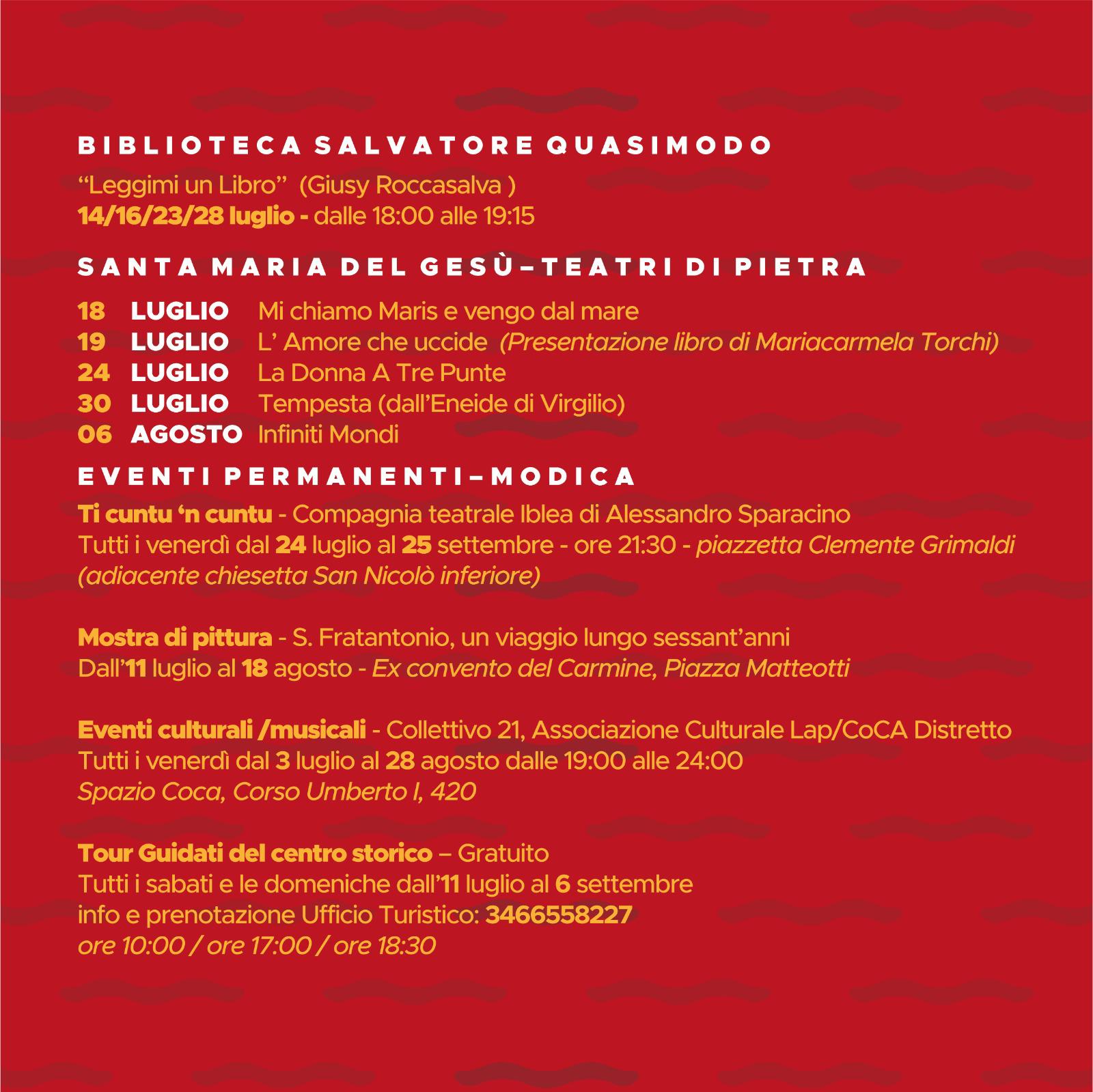 Molto ricco il programma del teatro diviso tra l’anfiteatro di S.Giuseppe u Timpuni e S.Maria del Gesù. Il 18 luglio Pippo Pattavina porta in scena Amori di Sicilia. A S.Maria in scena “Mi chiamo Maris e vengo dal mare”. Il 19 luglio L’Amore che uccide, presentazione del libro di Mariacarmela Torchi, mentre il 24 luglio in scena La Donna a tre Punte. Il 30 luglio Tempesta dall’Eneide di Virgilio. Il 6 agosto Infiniti Mondi. L’11 agosto Andrea Tidona e i Cunti re viddani, il 13 Enrico Lo Verso in “Uno, nessuno e centomila”, il 20 agosto Viaggio attraverso i dialetti. Per quanto riguarda gli eventi permanenti tutti i venerdi nella piazzetta Clemente Grimaldi “Ti cuntu ncuntu”, dall’11 luglio al 18 agosto ex Convento del Carmine la mostra del maestro Fratantonio, tutti i sabati e le domeniche tour guidati del centro storico e di Modica Alta.