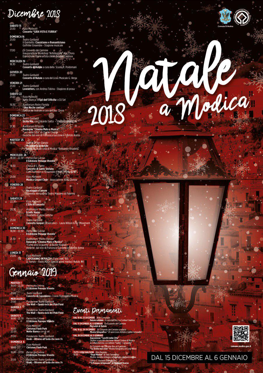 Dopo il successo di ChocoModica2018 la città si concentra sulle festività di Natale, per condividere le atmosfere natalizie all’insegna della condivisione e dello stare insieme come una vera e propria grande famiglia. L’Amministrazione comunale di Modica ha programmato un ricchissimo cartellone di eventi natalizi che offriranno ai cittadini e ai turisti intrattenimenti ed eventi di alto profilo. Da sabato 15 dicembre a domenica 6 gennaio musica, spettacolo, cultura e tradizioni si alterneranno tra piazza e teatro.