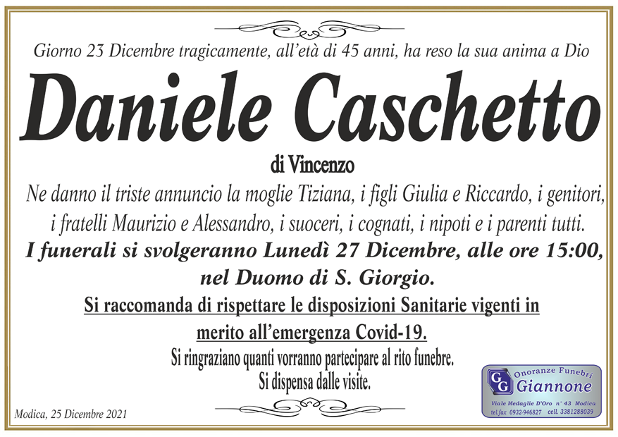 Necrologi: Daniele Caschetto. I funerali lunedì a San Giorgio a Modica