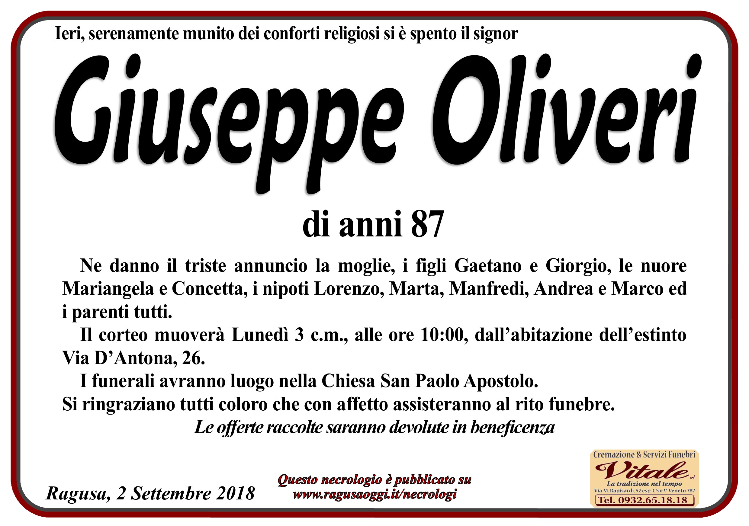 Necrologi Giuseppe Oliveri