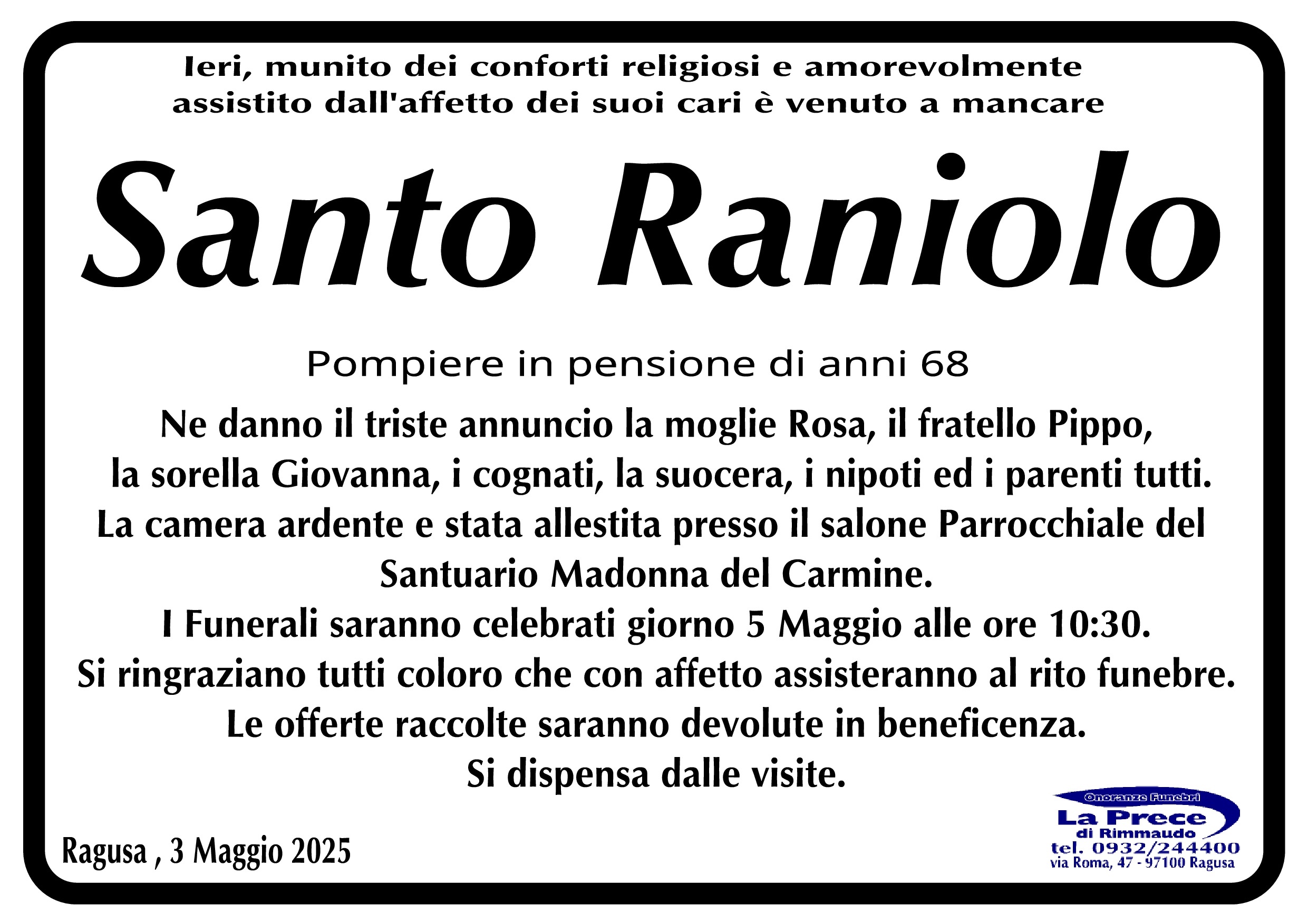 Necrologi: Santo Raniolo