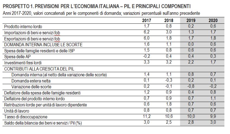 L’indice di fiducia delle imprese ha registrato, invece, un lieve aumento, legato all’evoluzione positiva dei giudizi e delle attese sugli ordini nel settore dei servizi. L’indicatore anticipatore segnala il proseguimento della fase di modesta dinamica dei livelli di attività economica. Nell’ultima parte dell’anno, l’evoluzione del Pil è attesa proseguire sui ritmi dei mesi precedenti e la crescita in media annua attestarsi allo 0,2%. La domanda interna al netto delle scorte fornirà il principale contributo positivo (+0,8 punti percentuali), con apporti simili sia dei consumi delle famiglie sia degli investimenti. Nel 2020, il tasso di crescita del Pil è previsto in leggera accelerazione (+0,6%) rispetto al 2019, sostenuto dai consumi e dagli investimenti, nonostante una decelerazione della crescita stimata per questi ultimi.
