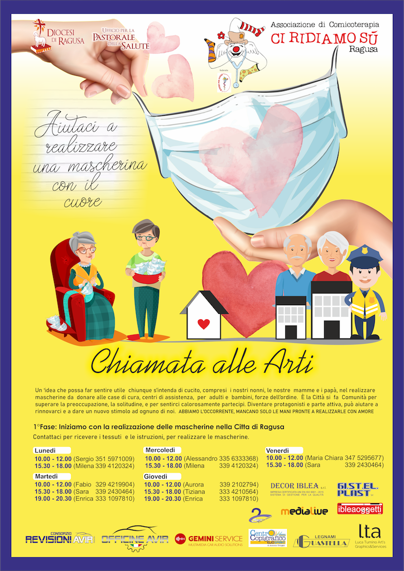 RAGUSA – Una straordinaria “Chiamata alle Arti” per nonne, mamme, volontari, appassionati di cucito per realizzare col cuore le mascherine lavabili da donare. I clown dottori dell’associazione “Ci ridiamo sù”, grazie al pieno supporto e sostegno di vari sponsor, lanciano una speciale “chiamata” per coinvolgere i semplici cittadini direttamente da casa nella produzione di mascherine in tnt e in cotone da donare ai centri di assistenza per adulti e bambini, agli istituti di riposo per anziani, alle forze dell’ordine.