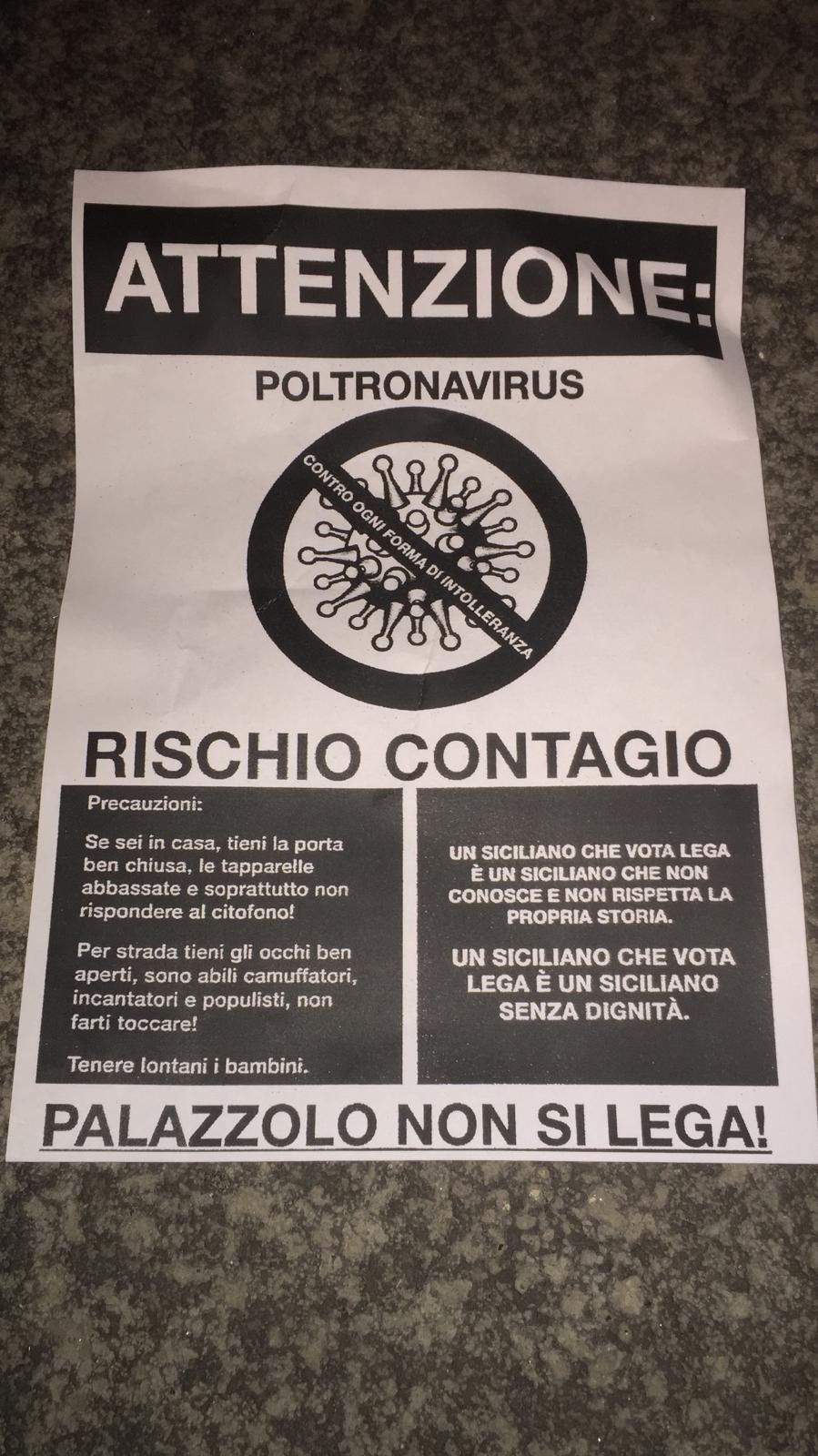 Bene in mostra anche dei volantini sul rischio “poltronavirus”, con chiaro riferimento al passaggio tra le fila della Lega del sindaco Salvatore Gallo, a suo tempo eletto con una lista civica. Una scelta, la sua, evidentemente non gradita da non pochi palazzolesi.