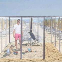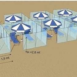 L’azienda ha progettato su una spiaggia della riviera romagnola box trasparenti con pareti di plexiglass e profili in alluminio, di 4,5 metri per lato con un “accesso” da un metro e mezzo di ampiezza. Ma tra le proposte c’è anche quella quella di lasciare almeno tre metri tra un ombrellone e l’altro, in aggiunta a barriere di plexiglass da interporre tra ogni coppia di lettini”.