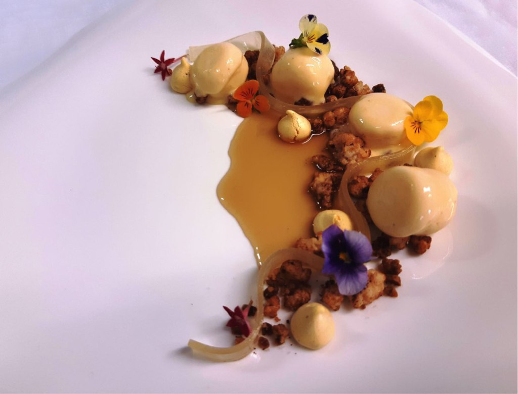 *Profumato, piacevolmente dolce quanto basta perchè equilibrato dalle note tostate del crumble al caffè e dalle spezie delle meringhette ed infine dal thè servito tiepido che arricchito dal geranio e dalle foglie di chiodi di garofano accende tutti i gusti e gli aromi nascosti.* *Una ricetta creata dal due stelle Michelin Vincenzo Candiano del ristorante “Locanda Don Serafino” di Ragusa Ibla con Madame de Bourbon . L’azienda Madame de Bourbon, esportatrice di eccellenze alimentari rare e preziose, nasce a Réunion, isola francese nell’Oceano Indiano ed è la realizzazione del sogno di due nostri gourmand residenti ormai da molti anni sull’isola, costantemente alla ricerca della migliore qualità. *