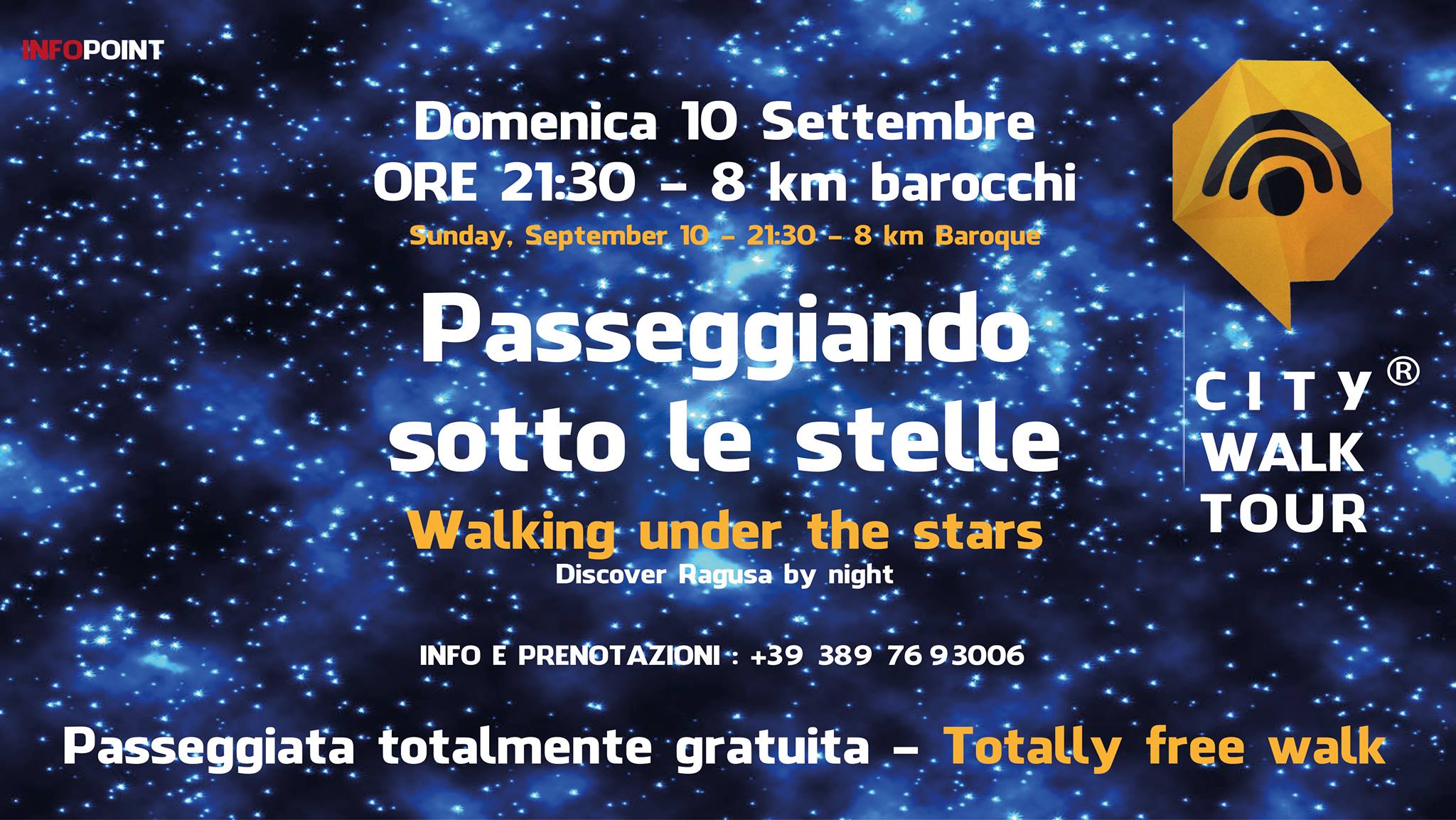 Cresce l’attesa per la speciale passeggiata sotto le stelle che viene proposta a Ragusa questa domenica 10 settembre. L’iniziativa è di City Walk Tour ed è la prima passeggiata di inizio autunno con Discover Ragusa by Night. E’ previsto un percorso notturno trekking lungo 8 km alla scoperta di Ragusa di notte. Nuovi percorsi alla scoperta di un’area di Ragusa inesplorata con le torcette sulla testa. La passeggiata è gratuita e richiede esclusivamente una prenotazione. Partenza ore 21:30 da Piazza San Giovanni rientro per mezzanotte. Brindisi bordo piscina nella misteriosa Ibla offerto dallo stabilimento balneare AZIZ. Info e prenotazioni al +39 389 7693006. Paura dei fantasmi ? Rimanete a casa !