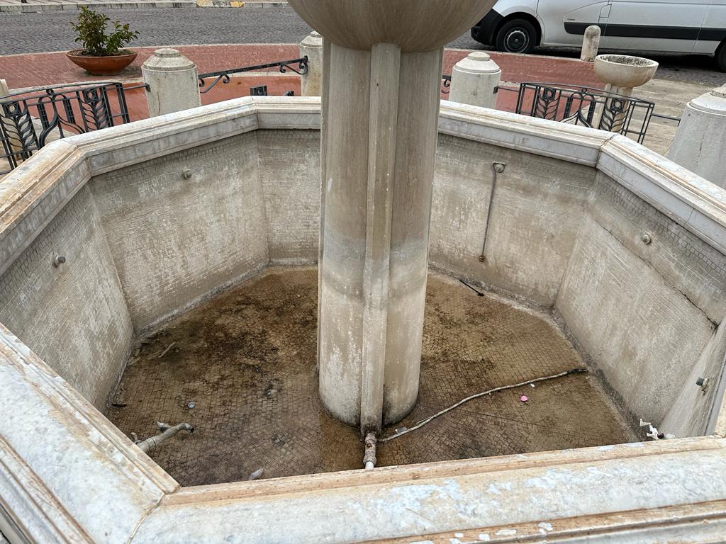 Piazza Gramsci: fontana senza acqua e abbandonata a se stessa da quasi 5 anni. Illuminazione pubblica fatiscente (pare che si aspetti la sostituzione dei vecchi impianti con altri a led).