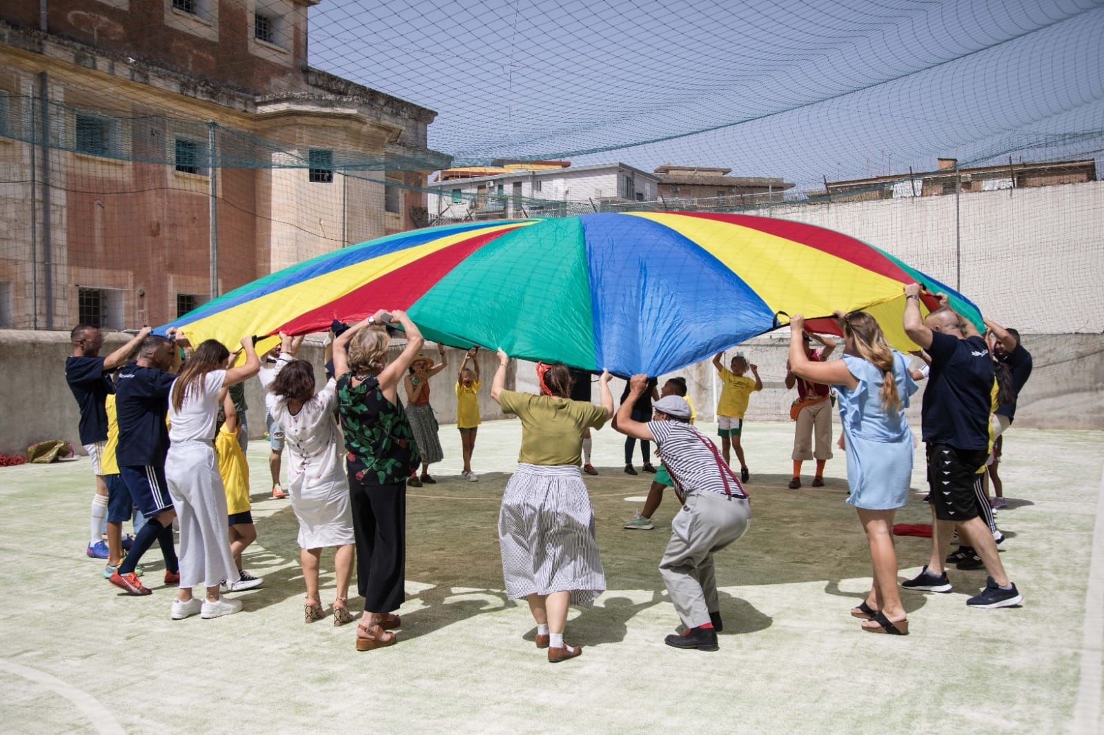 Prima della partita un riscaldamento speciale giocato col paracadute. L’emozione e la bellezza hanno toccato vette altissime coinvolgendo tutti con una straordinaria naturalezza, compresi i dipendenti, i funzionari e la direttrice stessa. Un linguaggio unico volutamente comprensivo di vicinanza umana.