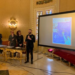 NOTO – Un francobollo con il blu dell’Oceano Atlantico e la Statua della Libertà su cui “scendono” i petali tricolore che fuoriescono dal leone di Palazzo Nicolaci.