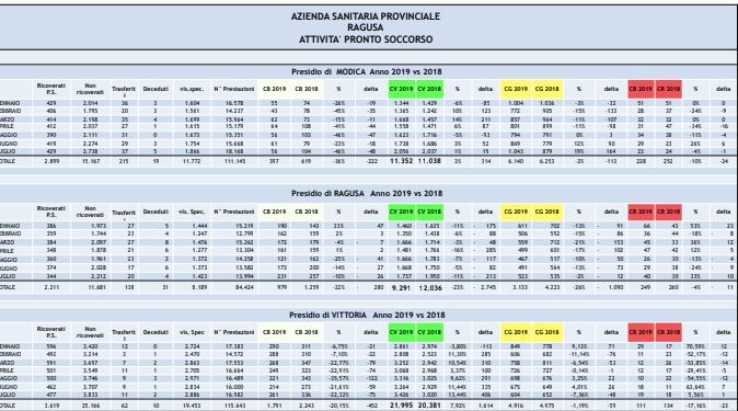 Tendenzialmente, i codici verdi aumentano, tranne nell’attività del pronto soccorso del presidio ospedaliero di Ragusa che passa da 12.036 del 2018 al 9.291 del 2019.