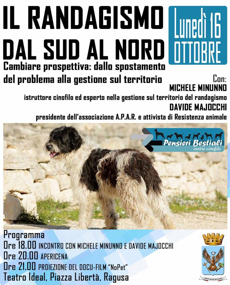 Dopo il convegno si proseguirà alle ore 20.00 con un Apericena a sostegno del Rifugio sanitario di Ragusa e alle 21 con la proiezione del Docu-film “NoPet” incentrato sull’annosa questione randagi (e non solo…). Per mezzo di uno stile evocativo realizza un approfondimento del tema sullo scorrere di immagini di vita di cani cagne donne uomini e altri animali. Le riprese effettuate fra Puglia, Sicilia e resto del mondo sparso, s’intrecciano a stralci d’interviste all’educatore cinofilo Michele Minunno, all’attivista/scrittore Troglodita Tribe Fabio Santa Maria, alla ricercatrice universitaria Susan McHugh e all’operatore antipsichiatrico Giuseppe Bucalo. Da un’idea di Davide Majocchi, con le riprese – fra gli altri – di Francesca Suppini e Rebecca Porrari, il montaggio della videoteppista Antonella Grieco e le musiche originali di Giona Vinti. Grazie al sostegno di Oltrelaspecie e nell’ispirazione data da resistenzanimale.noblogs.org.