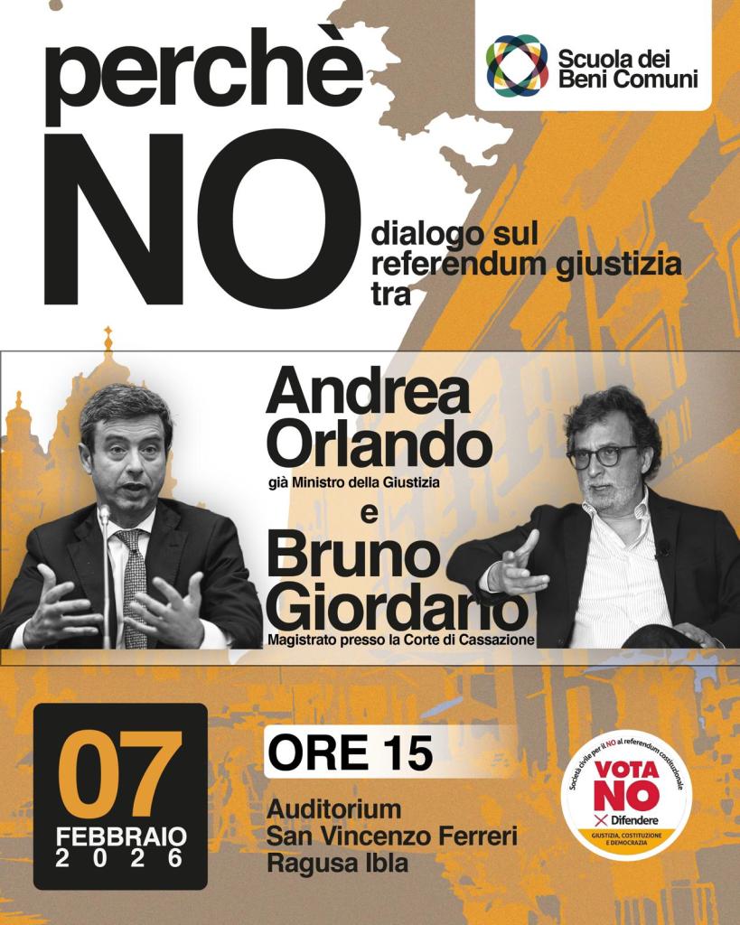 Un’occasione di confronto e approfondimento sul prossimo Referendum Costituzionale sulla Giustizia che si terrà il 22 e 23 marzo e per spiegare le ragioni del “no”. È questa la finalità del dialogo tra Andrea Orlando, già Ministro della Giustizia, e Bruno Giordano Magistrato presso la Corte di Cassazione e presidente del Comitato per il No della provincia di Ragusa, che si terrà sabato 7 febbraio alle ore 15 presso l’Auditorium San Vincenzo Ferreri (Via Giardino 1)