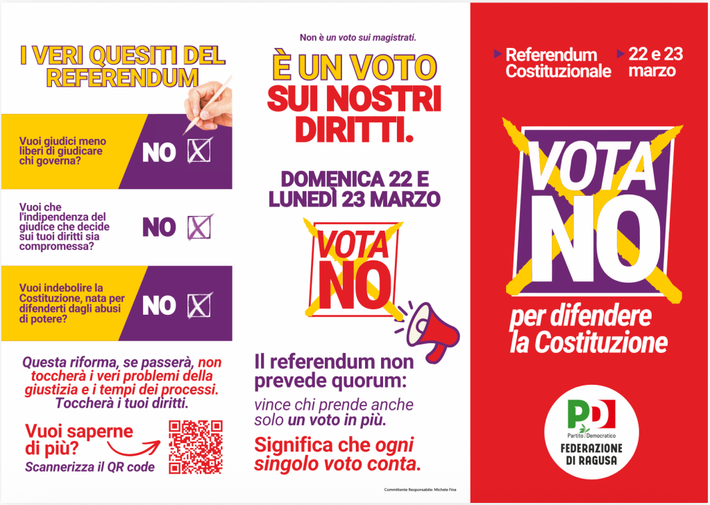 La Federazione provinciale del Partito Democratico di Ragusa annuncia l’avvio di una mobilitazione straordinaria in vista del referendum costituzionale del 22 e 23 marzo, schierandosi con convinzione per il No.