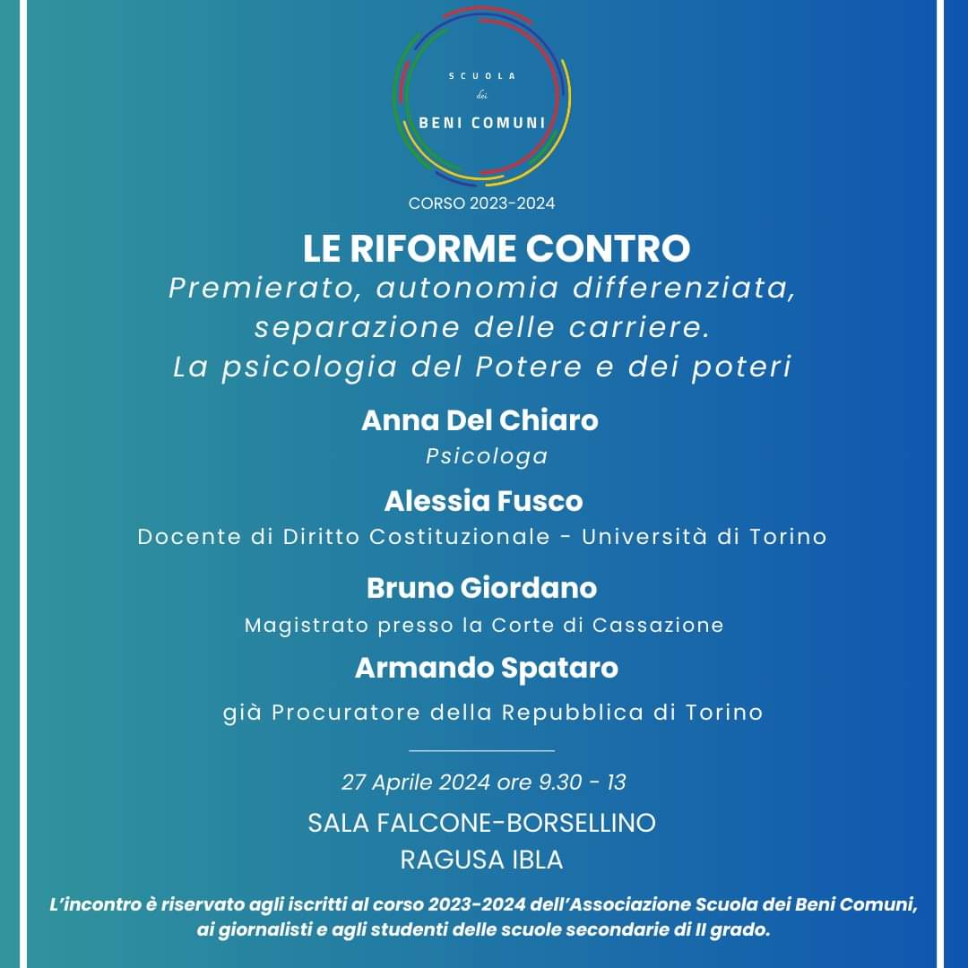 Sabato prossimo, 27 aprile 2024 alle 9,30 nella sala Falcone e Borsellino di via Torrenuova a Ragusa Ibla si terrà il settimo incontro della Scuola dei Beni Comuni.
