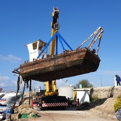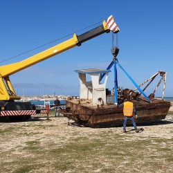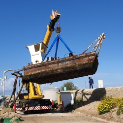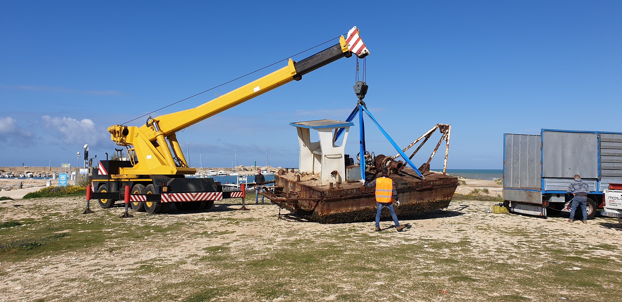 Dopo 20 anni di ormeggio nel braccio di ponente del porto di Scoglitti, è stato rimosso un pontone in ferro di oltre 6 tonnellate, utilizzato come supporto per i precedenti lavori di messa in sicurezza del molo di levante.