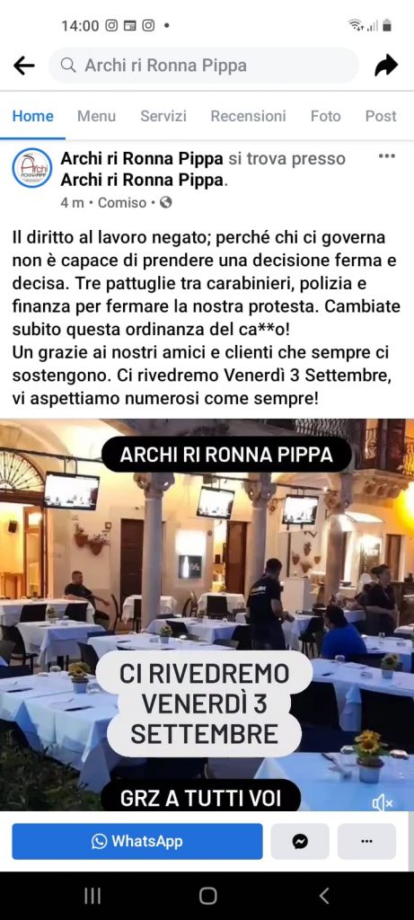 Intanto uno dei ristoratori multati e chiusi scrive si sfoga su facebook: “Il diritto al lavoro negato; perché chi ci governa non è capace di prendere una decisione ferma e decisa. Tre pattuglie tra carabinieri, polizia e finanza per fermare la nostra protesta. Cambiate subito questa ordinanza del ca**o! Un grazie ai nostri amici e clienti che sempre ci sostengono. Ci rivedremo Venerdì 3 Settembre, vi aspettiamo numerosi come sempre!”