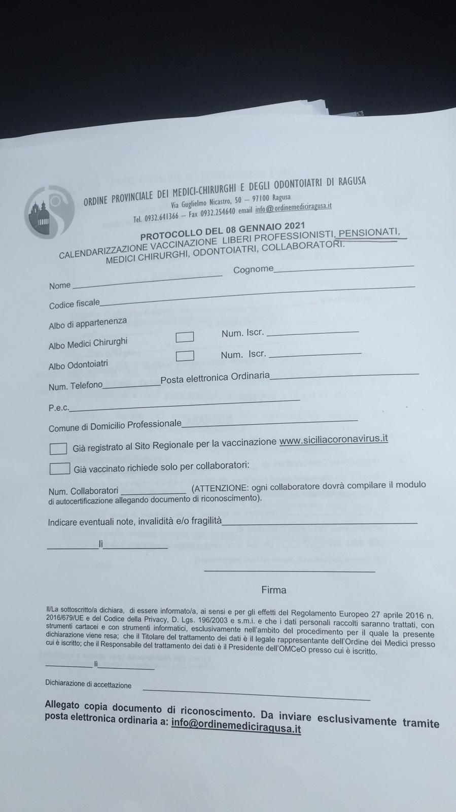Raggiunto telefonicamente, infatti, ci spiega: “Giorno 6 gennaio mi telefona l’ufficio igiene pubblica di Pozzallo chiedendomi se potevo essere vaccinato. Ho provveduto a firmare la modulistica e venerdì 8 gennaio sono stato vaccinato alle 17 a Pozzallo. Tra l’altro, ho chiesto esplicitamente di essere vaccinato per ultimo e che fosse data la precedenza ad altri. Io sono un medico in pensione, ma sono regolarmente iscritto all’albo. Infatti, offro consulenze e posso effettuare delle visite private. Pochi giorni dopo mi arriva una comunicazione dal mio albo professionale: un modulo in cui viene spiegato che popssono vaccinarsi tutti i medici regolarmente iscritti all’albo, ovvero pensionati, liberi professionasti e via dicendo”. (Alleghiamo modulo).