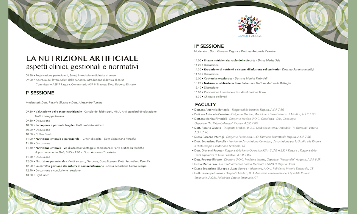 Con il convegno medico gratuito “La nutrizione artificiale”, SAMOT Ragusa Onlus, l’associazione impegnata da oltre 20 anni sul territorio siciliano nell’assistenza ai malati terminali attraverso le cure palliative, affronta l’argomento insieme a relatori provenienti da tutta la Sicilia. Sabato prossimo, 3 marzo, a partire dalle ore 9.00, al Poggio del Sole Resort sulla Ragusa mare, un’intera giornata di interventi per fornire un quadro completo ed esaustivo sugli aspetti clinici, gestionali e normativi in materia di nutrizione artificiale. Il convegno gode del patrocinio dell’ASP 7 di Ragusa, dell’ASP 8 di Siracusa, dell’Ordine dei Medici della Provincia di Ragusa, della Società Italiana di Cure Palliative (SICP), della Federazione Cure Palliative (FEDCP) e della Società MediCare di Ragusa ed ha ricevuto l’accreditamento per 8 crediti formativi ECM. Organizzato grazie anche al contributo di Nutricia, prevede l’iscrizione gratuita ed aperta a tutte le professioni sanitarie. La segreteria scientifica ed organizzativa è curata dalla SAMOT Ragusa Onlus. Tra i temi trattati: la valutazione dello stato nutrizionale, le indicazioni alla nutrizione parenterale ed enterale e la corretta gestione dei sistemi di somministrazione, la sarcopenia e il paziente fragile, la cachessia neoplastica e la nutrizione artificiale nelle Cure Palliative e non ultimi gli aspetti normativi e organizzativi.
