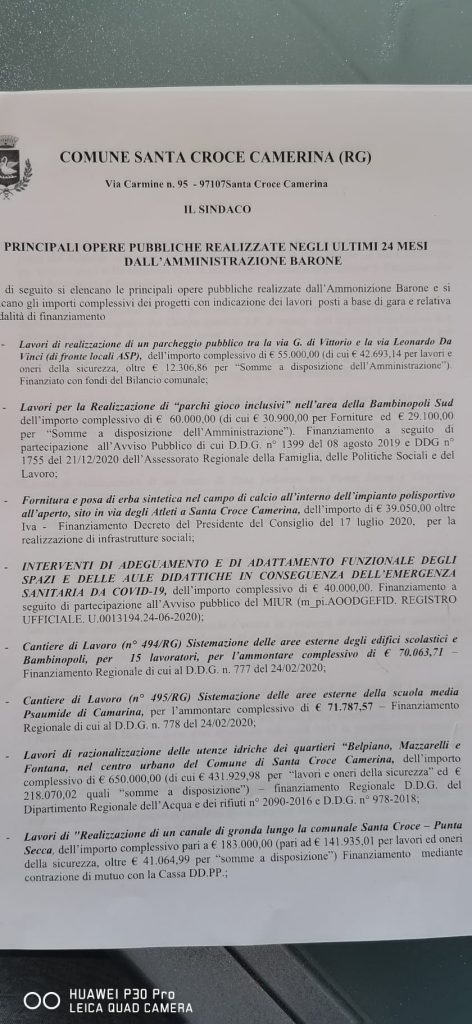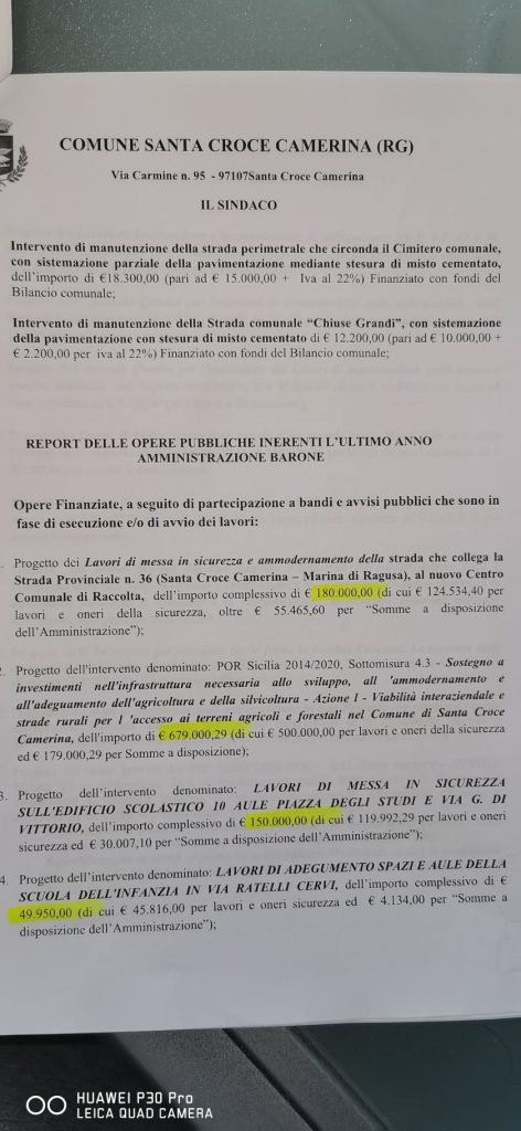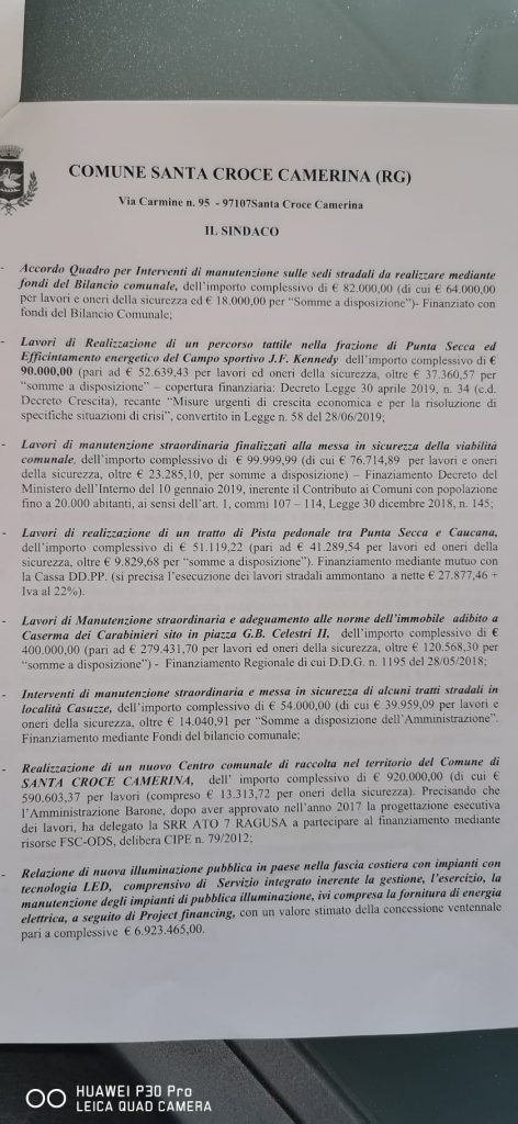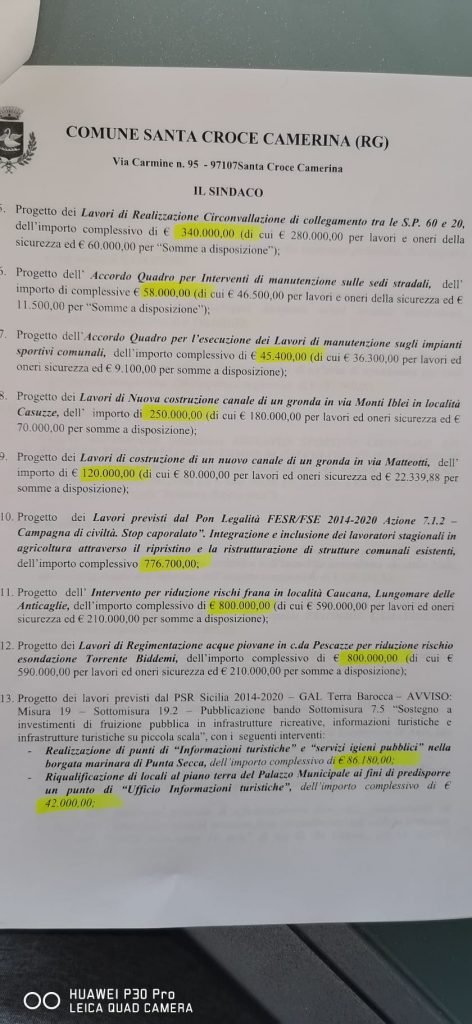 SANTA CROCE CAMERINA – Opere per milioni di euro tra quelli già appaltati e quelli in itinere e che sono in attesa di essere presentati in una bella brochoure di fine mandato. E’ la risposta dell’Amministrazione Barone di Santa Croce Camerina alle polemiche suscitate dalla nomina del nuovo assessore, Paolo Ferrara, risposte rivolte all’opposizione e non solo.