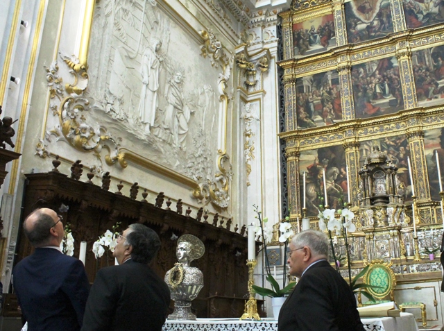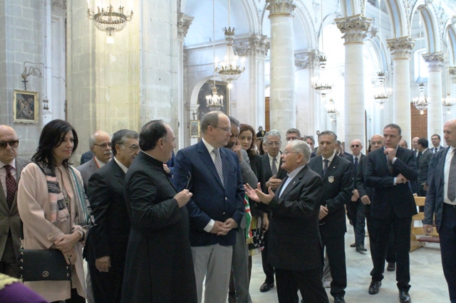 Lo storico Giuseppe Barone ha accompagnato il principe Alberto II di Monaco spiegando e illustrando, il Polittico seicentesco di Bernandino Nigro, l’altare con la Madonna della Neve di Bartolomeo Berrettaro e Giuliano Mancino. Altra visita al reliquario di San Giorgio, opera di argentieri veneziani, ai quadri dell’Assunta di Filippo Paladini e il Martirio di Sant’Ippolito.