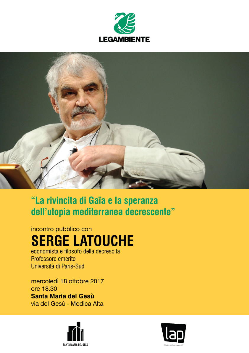 *L’economista e filosofo Serge Latouche a Modica per un incontro pubblico. “La rivincita di Gaïa e la speranza dell’utopia mediterranea decrescente”. Mercoledì 18 ottobre 2017 i circoli iblei di Legambiente avranno come ospite d’eccezione una personalità di rilievo nel panorama internazionale, l’economista e filosofo Serge Latouche, per un incontro aperto al pubblico. L’iniziativa ha per titolo “La rivincita di Gaïa e la speranza dell’utopia mediterranea decrescente” e si terrà a Santa Maria del Gesù (ex carcere) in via del Gesù a Modica Alta alle ore 18,30. Nel corso di questo incontro il filosofo francese esporrà le sue riflessioni sulle criticità ambientali, e non solo, che interessano l’intero pianeta Terra, e nello specifico l’area mediterranea, sulle sue cause, e sulle possibili vie d’uscita. Serge Latouche (Vannes 1940), professore emerito di Storia del pensiero economico all’Università di Paris- Sud ed esponente di primo piano del Mauss (Movimento Anti-Utilitarista nelle Scienze Sociali), è uno dei massimi esperti a livello internazionale in materia di sviluppo economico e sociale. A partire dai suoi studi sull’Africa, ha condotto una critica radicale al “mito dello sviluppo” e alle nuove forme di colonizzazione basate sulla diffusione dell’immaginario occidentale. Negli ultimi anni si è dedicato prevalentemente all’elaborazione del pensiero della “decrescita”, vale a dire di un’alternativa di società liberata dall’ossessione della crescita economica illimitata, che si dimostra più che mai insostenibile sotto il profilo ecologico e umano. Numerosi movimenti sono sorti nel mondo (in particolare, in Francia e in Italia) per sostenere questa prospettiva. Tra le sue numerose opere, ricordiamo: L’occidentalizzazione del mondo. Saggio sul significato, la portata e i limiti dell’uniformazione planetaria (1992), Il pianeta dei naufraghi. Saggio sul doposviluppo (1993), L’altra Africa. Tra dono e mercato (1997), La sfida di Minerva. Razionalità occidentale e ragione mediterranea (2000), Giustizia senza limiti. La sfida dell’etica in una economia globalizzata (2003), L’invenzione dell’economia (2010), Come si esce dalla società dei consumi. Corsi e percorsi della decrescita (2011), Per un’abbondanza frugale. Malintesi e controversie sulla decrescita (2012), Limite (2012), Dove va il mondo? Un decennio sull’orlo della catastrofe (con Yves Cochet, Jean-Pierre Dupuy e Susan George, 2013), Usa e getta. Le follie dell’obsolescenza programmata (2013, n. ed. 2015), L’economia è una menzogna. Come mi sono accorto che il mondo si stava scavando la fossa (2014), e l’edizione in un unico volume (2015) di Breve trattato sulla decrescita serena (2008) e Come sopravvivere allo sviluppo. Dalla decolonizzazione dell’immaginario economico alla costruzione di una società alternativa (2005). Legambiente, cogliendo questa occasione, promuove, per le ore 17,30, la visita guidata del Chiostro e della Chiesa di Santa Maria del Gesù, a cura dell’Associazione LAP. Legambiente ringrazia l’associazione LAP per la collaborazione all’iniziativa e fa presente altresì che la stessa associazione, da circa un anno, si prende cura del complesso monumentale e ne consente le visite.*
