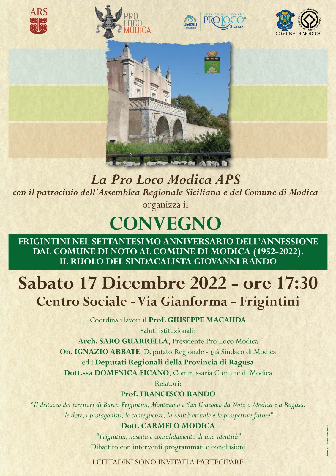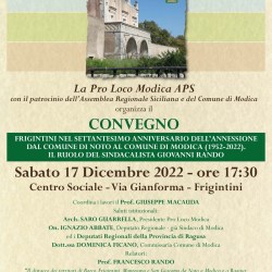 Il Convegno avrà il titolo: "Frigintini ex Noto nel settantesimo anniversario dell’annessione al Comune di Modica (1952- 2022). Il ruolo del sindacalista Giovanni Rando". Il convegno del 17/12/2022 organizzato dalla Pro Loco Modica APS, presieduta dall'architetto Rosario Guarrella, vuole ripercorrere i fatti accaduti dal 1946 al 1952 con tutto quello che ne è scaturito in termini di sviluppo economico e sociale nella frazione di Frigintini fino ai nostri giorni; relatori dell’evento saranno: il prof. Francesco Rando – “Il distacco dei territori di Barco,Frigintini, Montesano e San Giacomo da Noto a Modica e a Ragusa, le date, i protagonisti, le conseguenze, la realtà attuale e le prospettive future” e il dott. Carmelo Modica– “Frigintini: nascita e consolidamento di una realtà”. Gli atti del convegno e tutto il materiale reperito negli archivi della Regione Siciliana e del Comune di Modica verranno inseriti in un volume che sarà pubblicato nei primi mesi del 2023 e distribuito nelle biblioteche scolastiche, comunali e perivate o di chi ne farà richiesta a beneficio delle future generazioni.