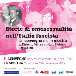 Sono numerosi gli enti promotori dell’iniziativa, che comprende una mostra e un convegno, dedicata a un tema di storia con significative implicazioni anche per il nostro presente, intitolata *Storie di omosessualità* *nell’Italia fascista*. Sia la mostra che il convegno saranno ospitati nei locali del Consorzio Universitario Ibleo, all’ex distretto Militare di Ragusa Ibla. La mostra resterà aperta per un mese, a partire dal pomeriggio del 25 ottobre, mentre il convegno si svolgerà il 27 ottobre dalle ore 15,30 alle ore 18,30. Promuovono l’iniziativa, che ha il patrocinio dell’AIPH- Associazione Italiana di Public History, l’università di Catania – SDS Lingue e letterature straniere Ragusa, il Consorzio Universitario Ibleo, l’Archivio degli Iblei, Agedo Ragusa, Agedo Torino, Cliomedia Officina.