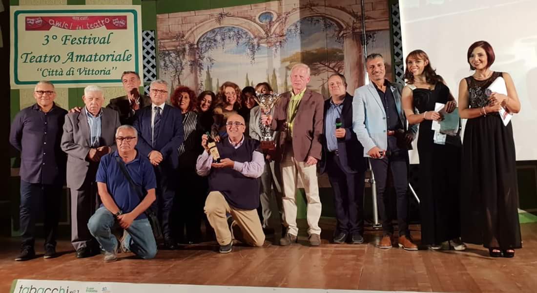 *Si è chiusa con un successo pieno per gli Amici del Teatro di Chiaramonte la 3° Rassegna di Teatro Amatoriale di Vittoria, organizzata dalla locale Compagnia degli Amici del Teatro , omonimi dei vincitori.* *La qualificata Giuria, che ha seguito tutti i sei spettacoli del cartellone, e presieduta dalla musicista prof.ssa Michela Bonavita, ha assegnato alla Compagnia chiaramontana il Premio come migliore gruppo. Il riconoscimento si accompagna ad altri prestigiosi premi, assegnati a Mario Bentivegna come migliore attore protagonista, Silvana Catania come migliore attrice protagonista, e Giovanni Calabrese come miglior attore attore non protagonista.* *Premi minori hanno fatto da contorno ad una affermazione corale degli attori chiaramontani, che hanno messo in scena un vecchio cavallo di Battaglia, U RUPPU RA CRAVATTA, di A. Danese, per la regia di Luciano Brullo, rappresentata negli anni precedenti in tutto il mondo, anche presso svariate comunità di siciliani residenti all’estero.* *Un bel riconoscimento per la compagnia , alla vigilia di un anno, il 2019, che vedrà festeggiare l’ambito traguardo dei 50 di attività ininterrotta. * *La serata di premiazione, ottimamente allestita dagli Amici del Teatro di Vittoria, si è svolta presso il Chiostro delle Grazie, alla presenza di un folto pubblico e delle rappresentanze di tutte le compagnie partecipanti, provenienti da svariate province siciliane.*