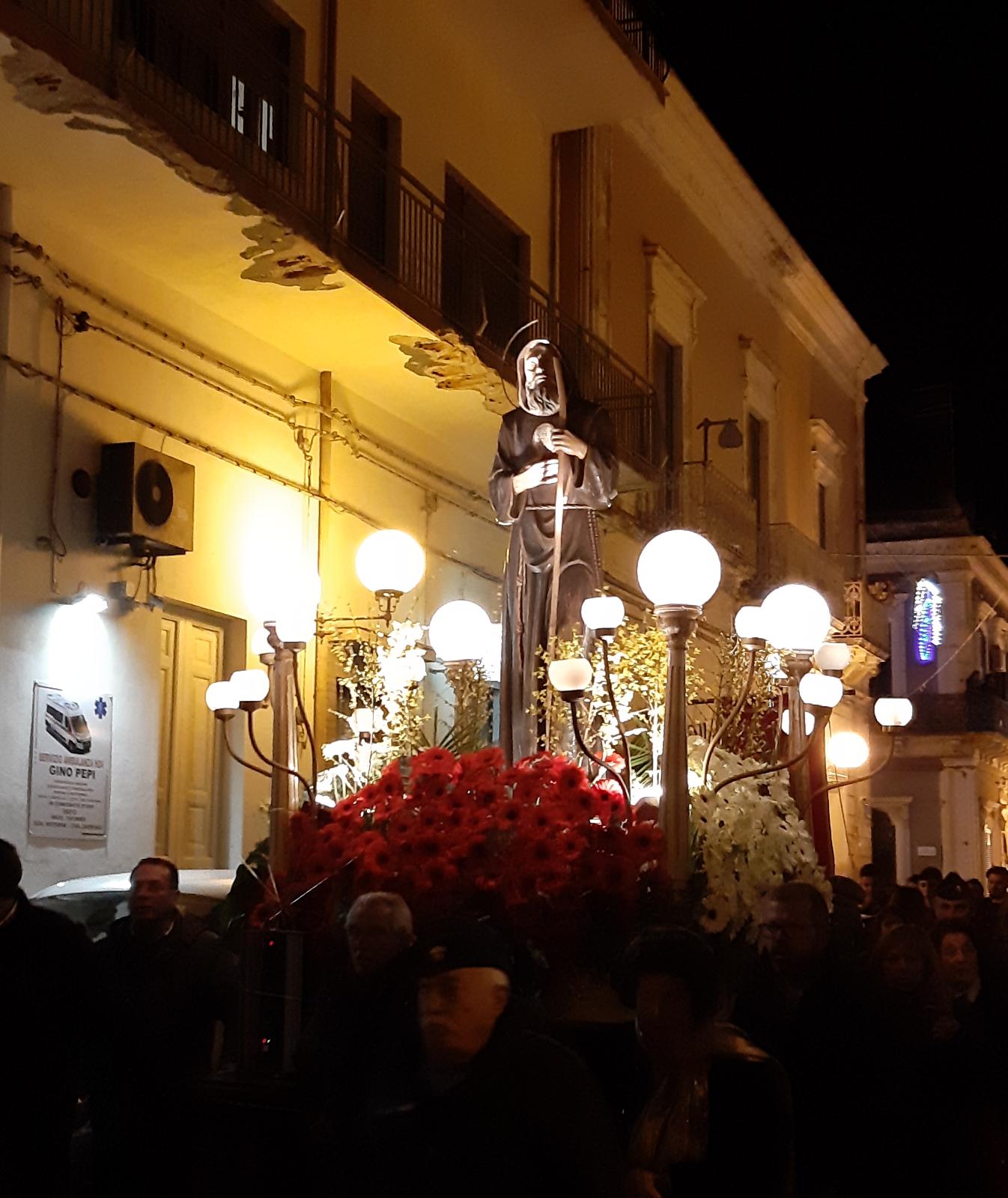 VITTORIA – Una processione partecipata. Per onorare il patrono della Sicilia e della gente di mare nel quinto centenario della canonizzazione. In molti i fedeli che ieri hanno voluto onorare San Francesco di Paola la cui festa, che aveva preso il via martedì scorso con la celebrazione della solennità liturgica da parte del vescovo di Ragusa, mons. Carmelo Cuttitta, si è conclusa proprio domenica sera. Il corteo processionale si è snodato per le principali vie del territorio parrocchiale con il simulacro e la reliquia del santo.