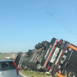 Tir finisce fuori strada e si capovolge