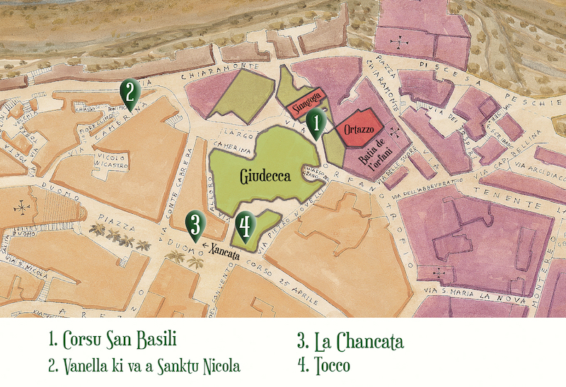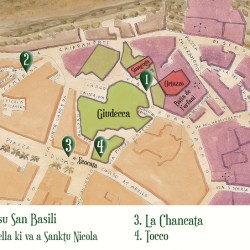 Per l’edizione 2018 si è scelto di andare indietro nel tempo per valorizzare il quartiere della Giudecca, ovvero uno dei due quartieri ebraici di Ragusa Ibla, una zona poco nota anche ai ragusani, ma la cui storia è scritta sulle mura dei palazzi e delle chiese che si trovano all’interno del vecchio perimetro. Racchiuso tra le stradine via Orfanotrofio, largo Camerina e via Pietro Novelli, il quartiere della Giudecca si trova vicinissimo alla famosa e visitatissima piazza San Giorgio e trova il suo punto di riferimento nella chiesa Santissima Annunziata sorta intorno al 1500. Il lavoro storico e di recupero documenti da parte dell’associazione “Edrisi” vuole mettere in risalto le origini di questa zona di Ragusa Ibla che fanno risalire la sua genesi al II secolo a.C. dove sorgeva un tempio dedicato a Diana, la dea latina. La storia affascinante di questo quartiere si è sviluppata anche nei secoli successivi, tra il IX e il XII secolo d.C., al tempo della conquista Saracena, quando l’area vede ospitare una moschea. A conferma di questa tesi, numerose leggende si mischiano alla storia documentata e si ritiene che dietro la cappella maggiore dell’attuale chiesa dell’Annunziata si trovino molteplici iscrizioni in carattere “cufico”, un tipo di calligrafia araba. Si ipotizza infatti che la chiesa attuale fosse all’epoca una sinagoga ed anche una scuola di medicina.